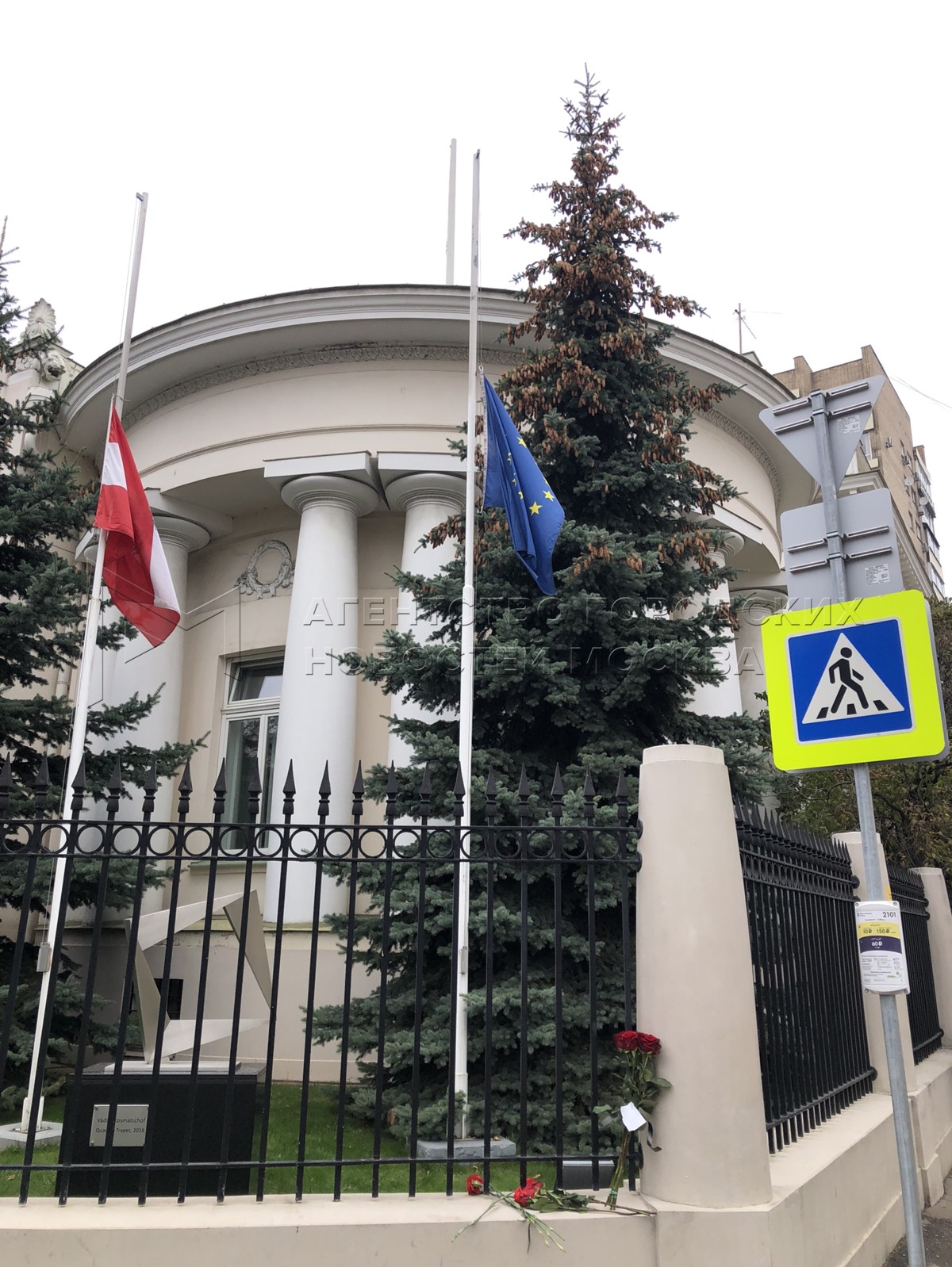 • Описание: Цветы у посольства Австрии в Москве в память о погибших в серии террористических атак в Вене.