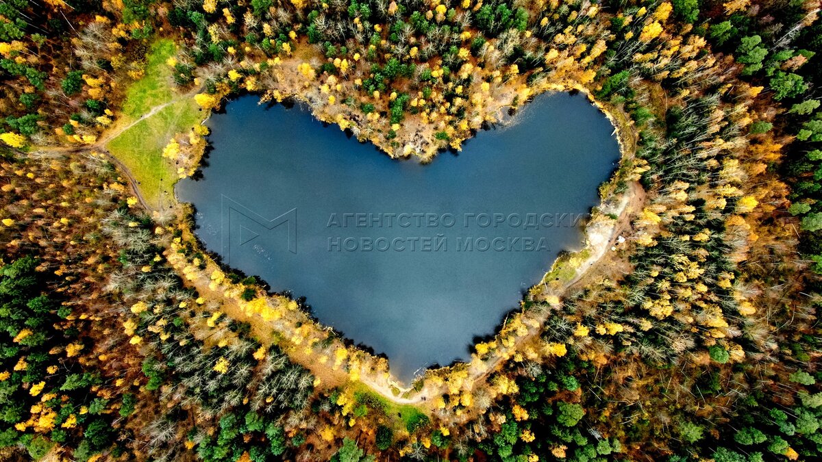 Вид с квадрокоптера на озеро Красное в Кучинском лесопарке в городском округе Бал...