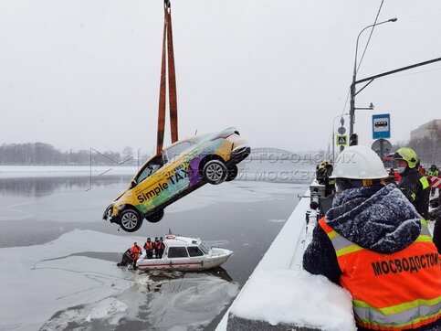 Работа оперативных служб на месте падения автомобиля такси в Москву-реку на Береж...