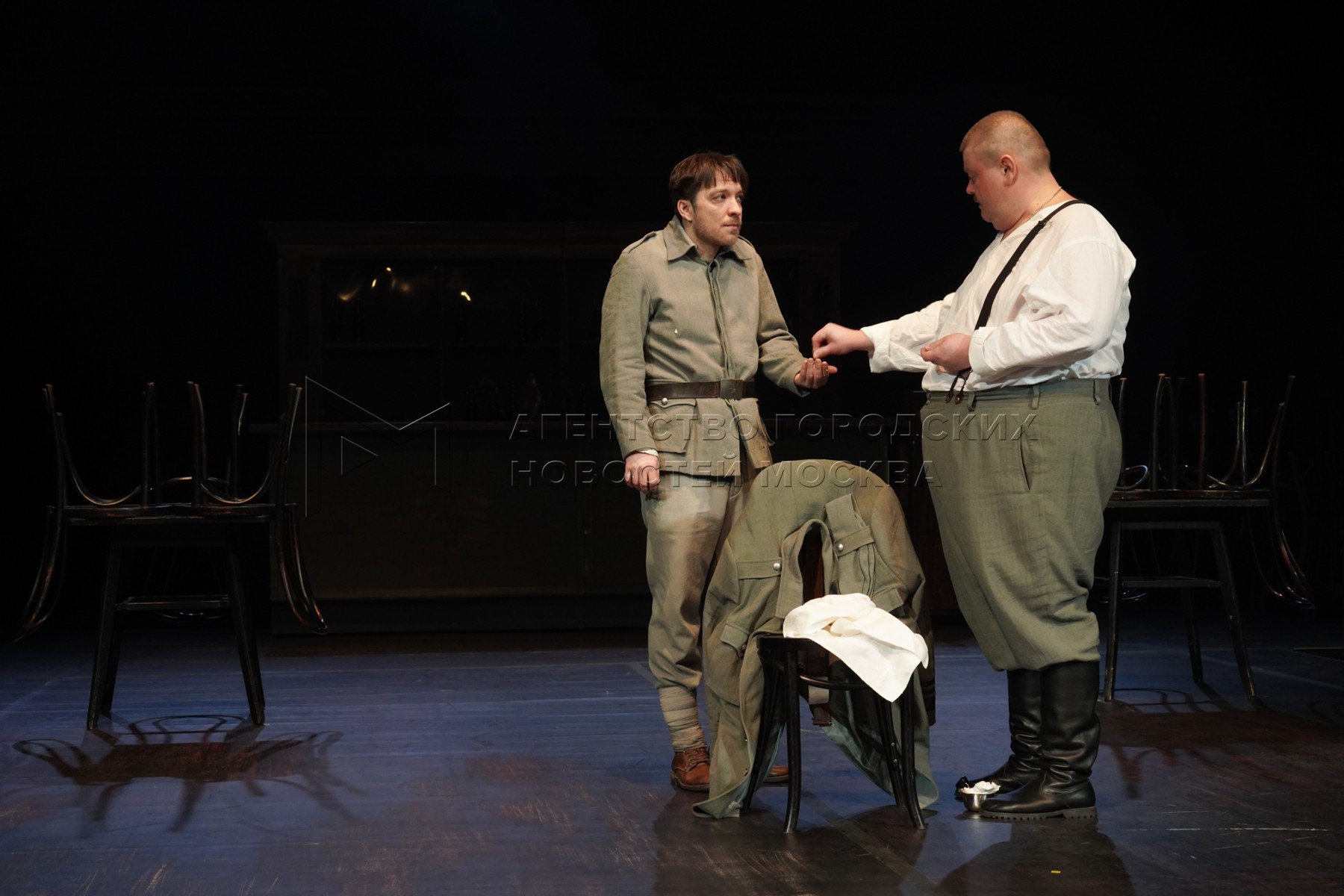 • Описание: Актеры Максим Севриновский в роли Войцека (слева) и Евгений Косырев в роли капитана во время показа премьерного спектакля «Войцек» по пьесе Георга Бюхнера на Новой сцене Театра имени Вахтангова.