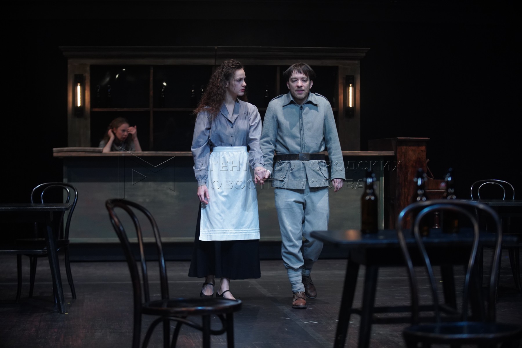 • Описание: Актеры Ася Домская в роли Марии и Максим Севриновский в роли Войцека во время показа премьерного спектакля «Войцек» по пьесе Георга Бюхнера на Новой сцене Театра имени Вахтангова.