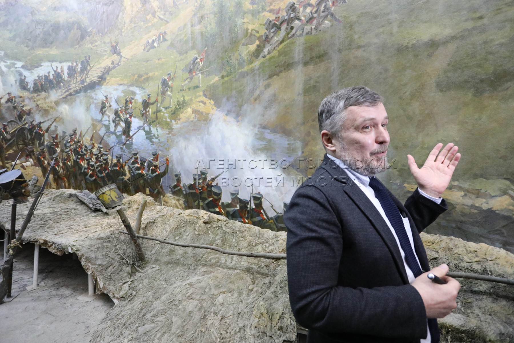 • Описание: Директор Музея-панорамы «Бородинская битва» Владимир Преснов во время показа результатов реставрации фрагмента полотна панорамы «Бородинская битва» в рамках проекта «Открытая реставрация 2019-2023».