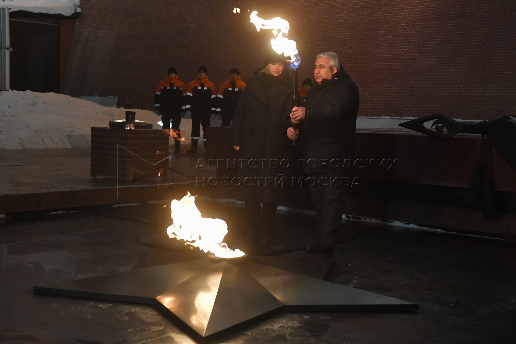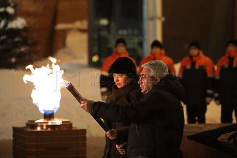 Сопредседатель Центрального штаба ОНФ, ответственный секретарь ООД «Поисковое движение России» Елена Цунаева и генеральный директор АО «Мосгаз» Гасан Гасангаджиев во время профилактики горелки Вечного огня на Могиле Неизвестного Солдата в Александровском саду в преддверии Дня защитника Отечества.