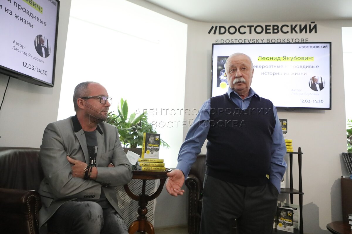 - Описание: Телеведущий Андрей Краснов (слева) и телеведущий, актер и народный артист РФ Леонид Якубович во время презентации своей книги «Плюс минус 30: невероятные и правдивые истории из моей жизни».
