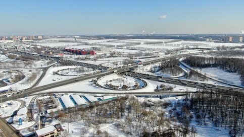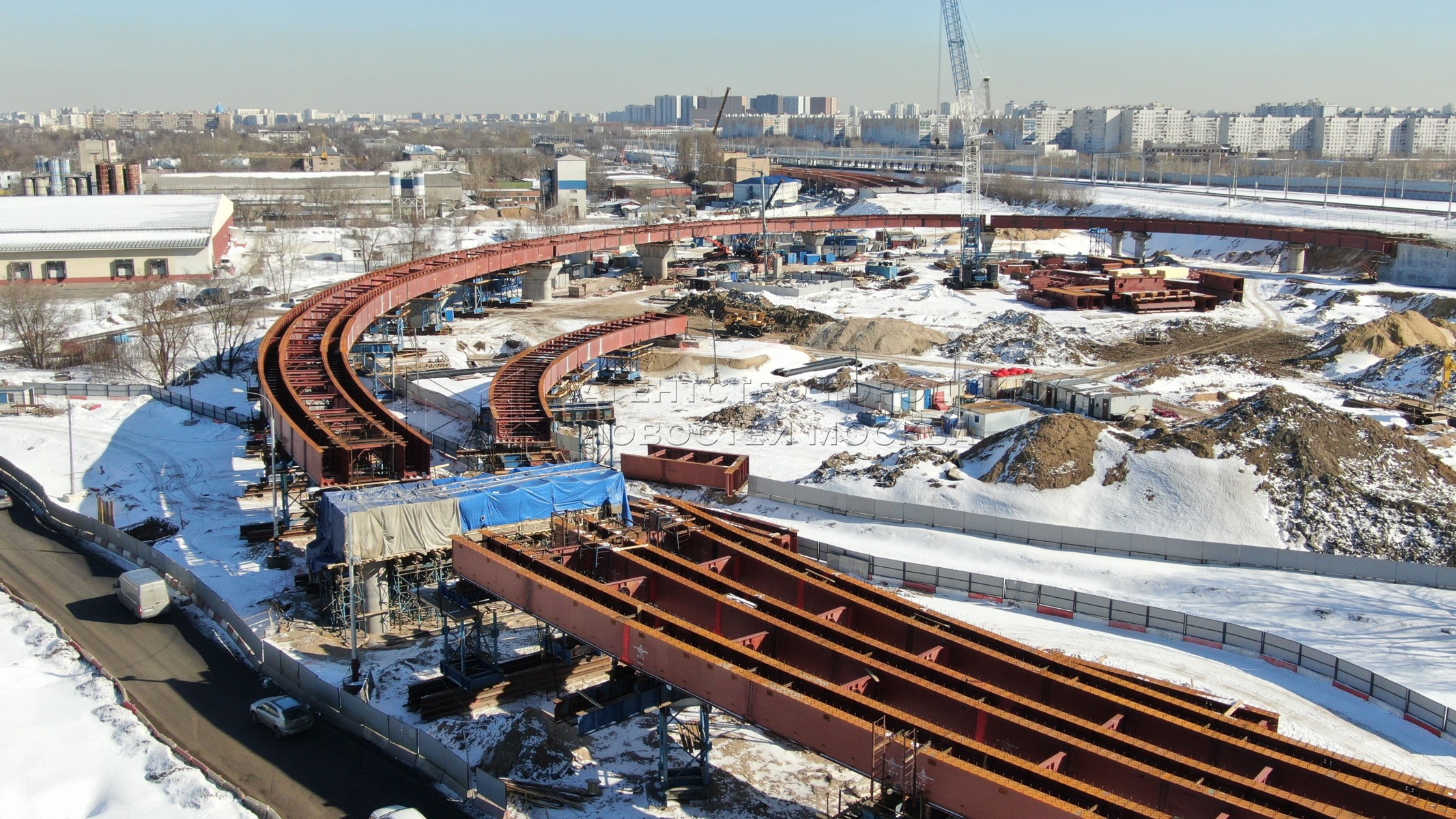 Вид с квадрокоптера на строительство участка Юго-Восточной хорды в районе Курьяно...