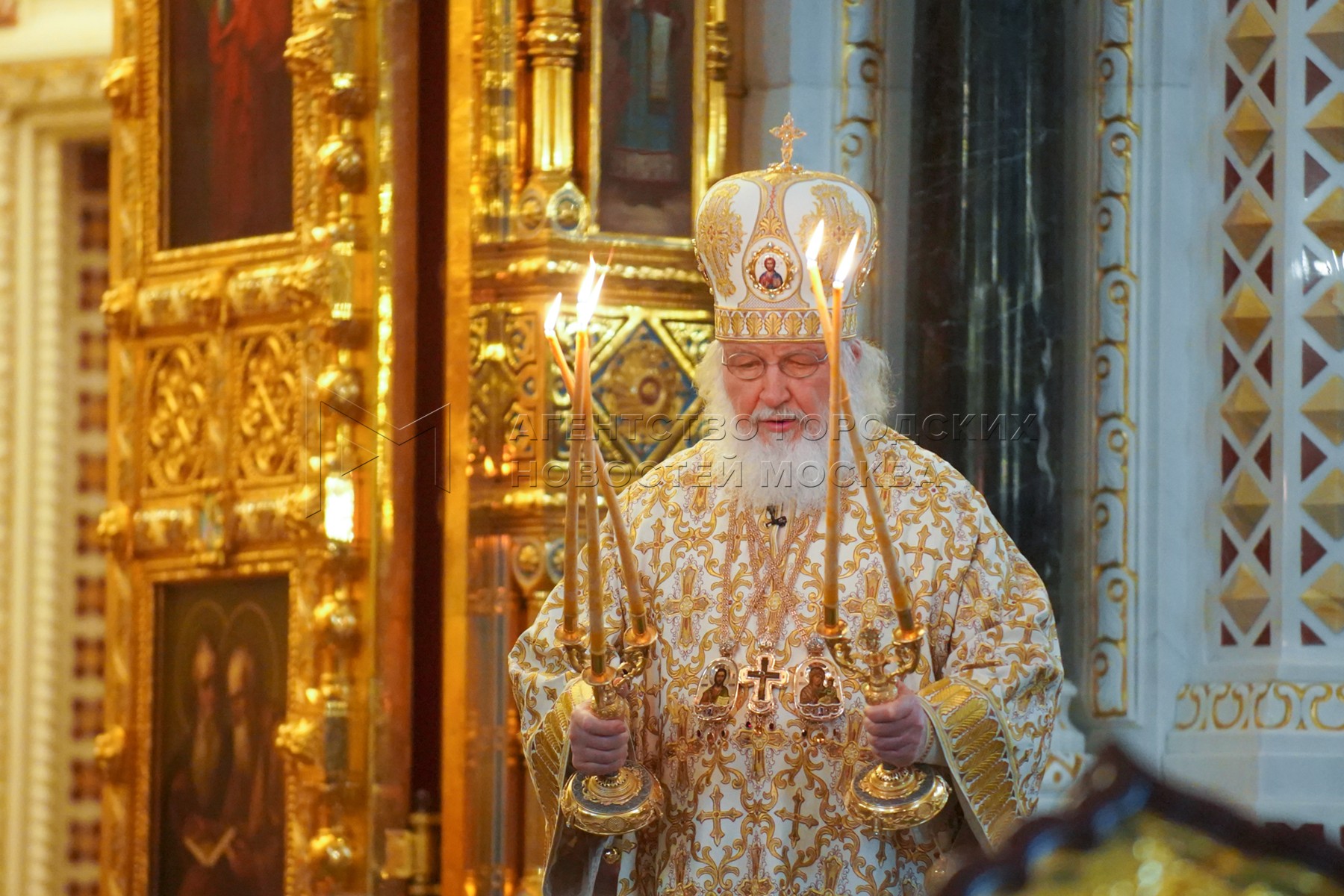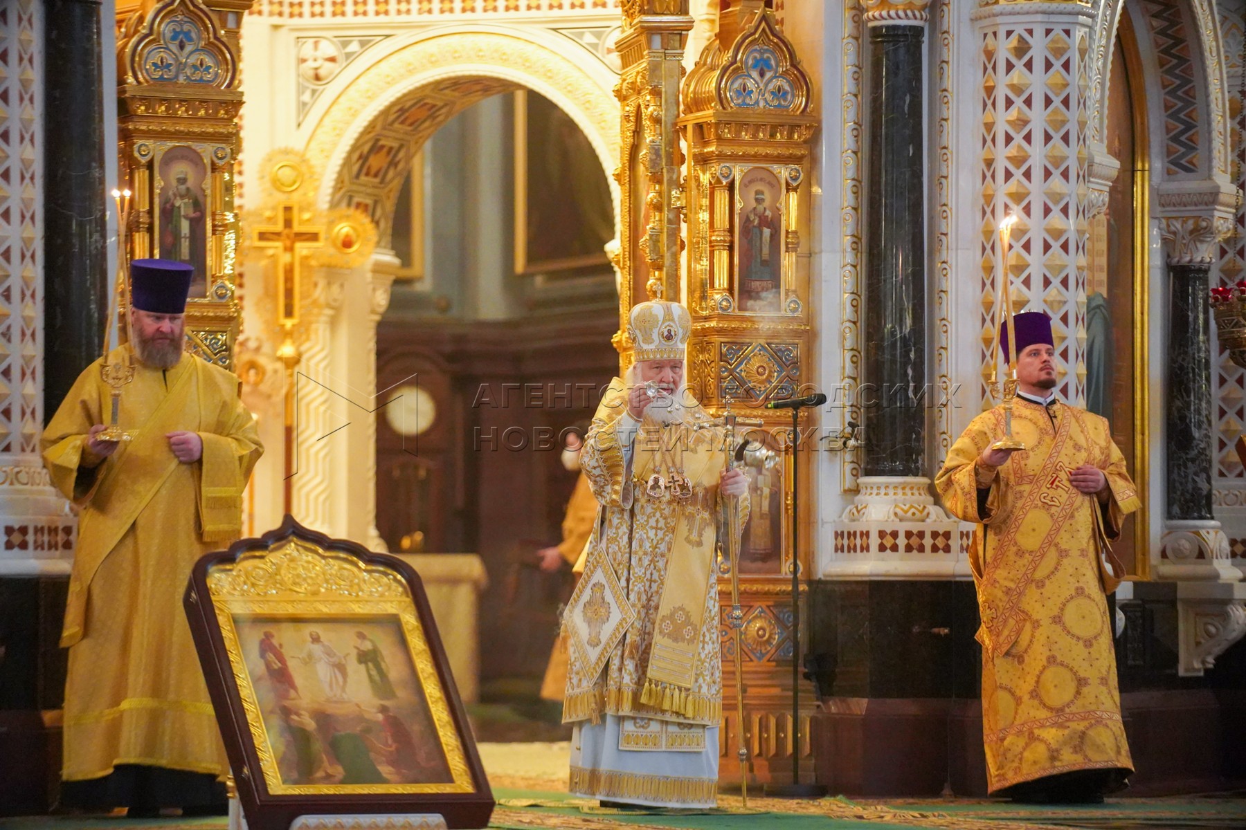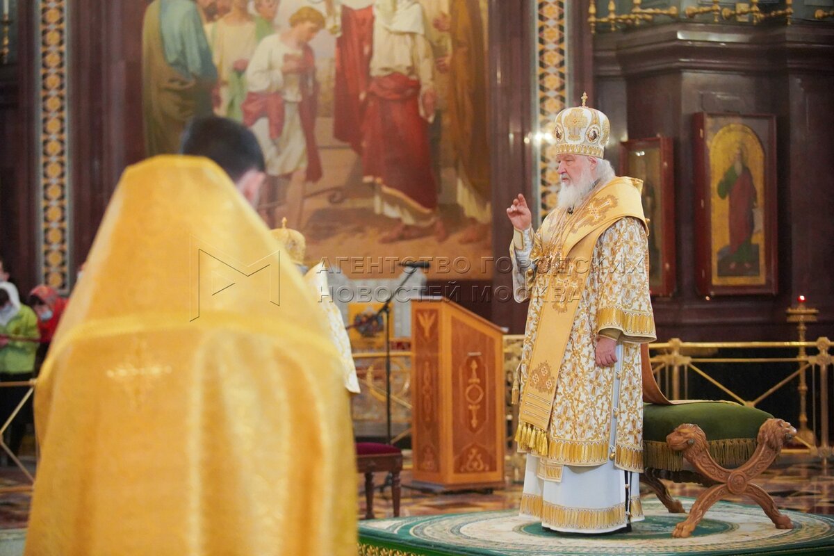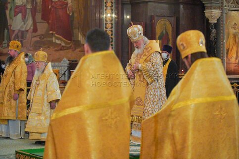 Патриарх Московский и всея Руси Кирилл (справа) во время Божественной литургии в ...