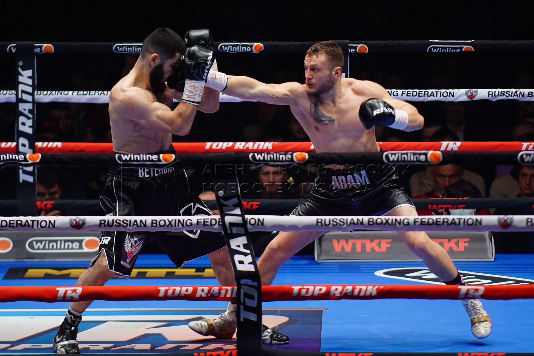 Российский спортсмен Артур Бетербиев, спортсмен из Германии Адам Дайнес (слева на...