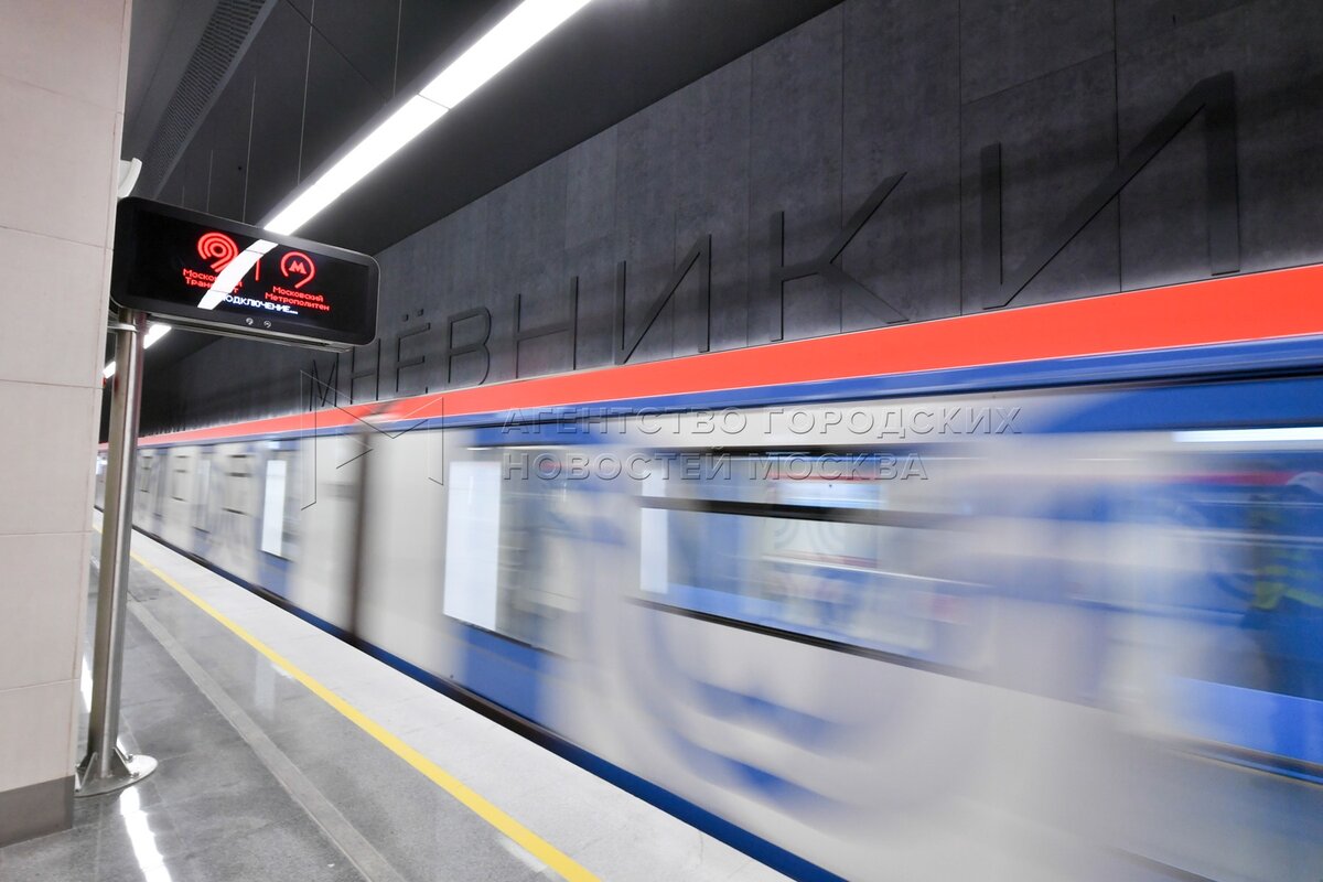 Вагон электропоезда на станции «Мневники» Большой кольцевой линии столичного метр...