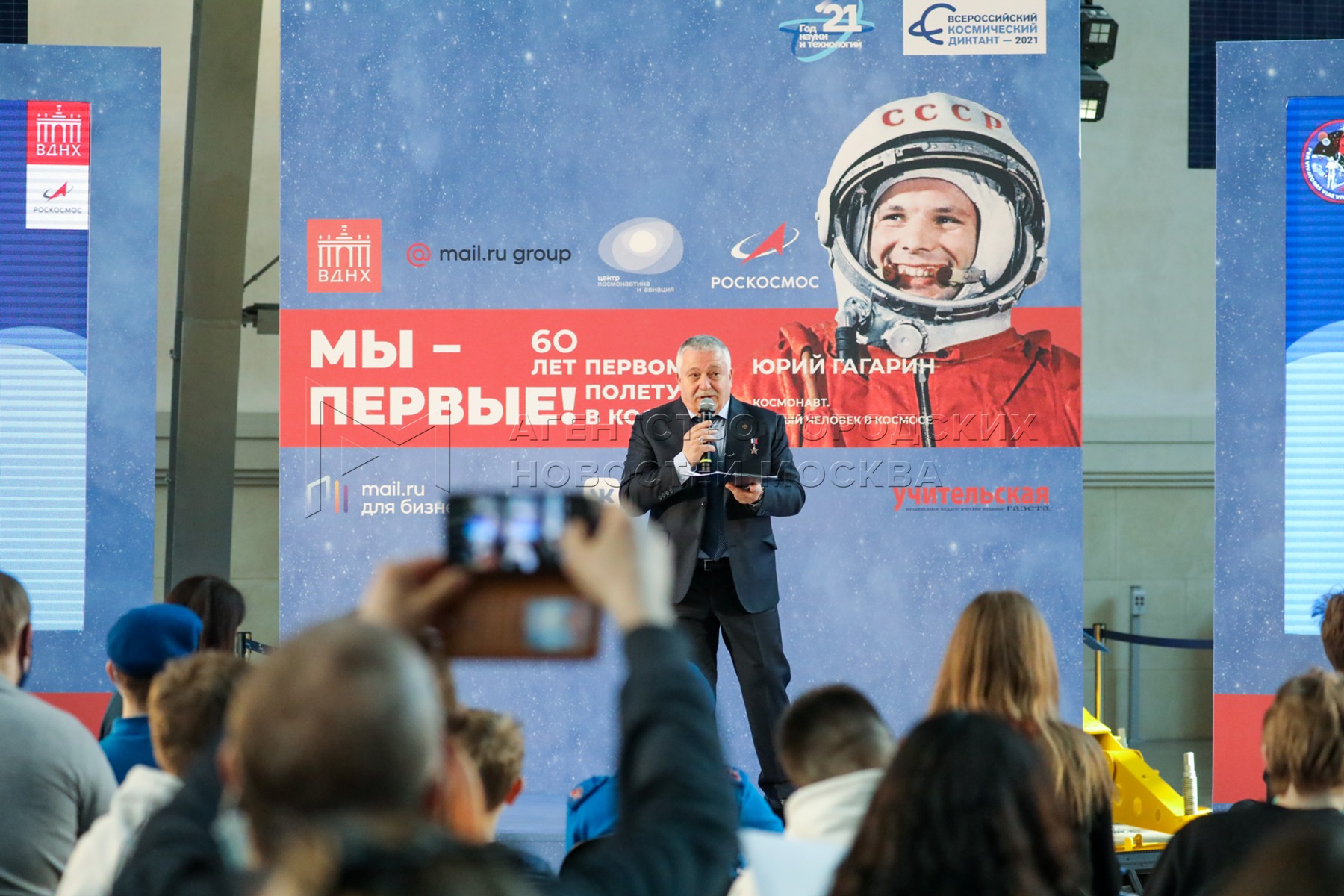 Космонавт Сергей Рязанский во время первого Всероссийского космического диктанта ...