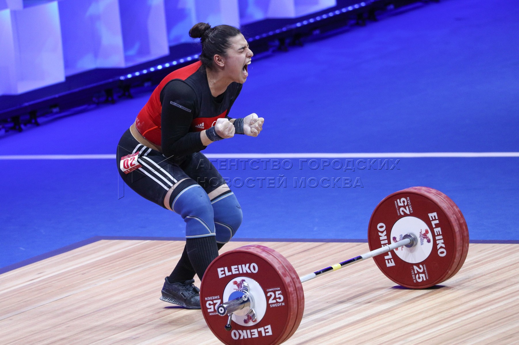 • Описание: Спортсменка Тугче Бойнежри (Турция) во время соревнований среди женщин в весовой категории свыше 87 кг на чемпионате Европы по тяжелой атлетике во Дворце гимнастики Ирины Винер-Усмановой.