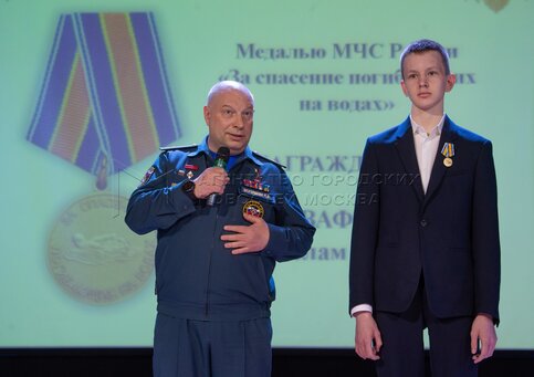 Герой России, советник Министра МЧС России Андрей Мерзликин (слева) и старшекласс...