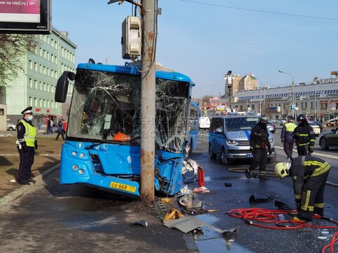 Последствия столкновения пассажирского автобуса с мачтой освещения на ул. Марксис...