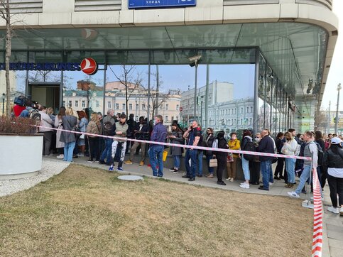 Очередь около офиса авиакомпании Turkish Airlines в Москве.