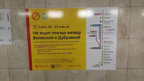 Объявления о закрытии с 1 по 23 мая участка между станциями «Дубровка» и «Волжская» Люблинско-Дмитровской линии Московского метрополитена для прокладки тоннеля Большой кольцевой линии (БКЛ) подземки.