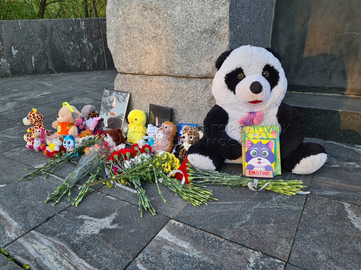 • Заголовок: Цветы и мягкие игрушки у памятника Мусе Джалилю на юге Москвы в память о погибших при стрельбе в Казани