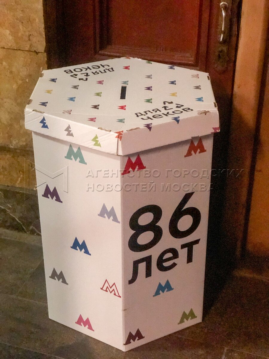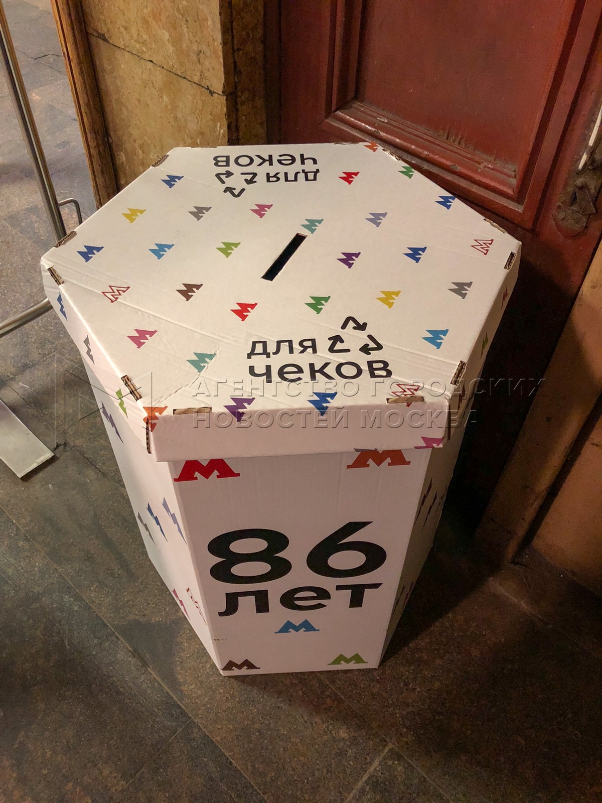 Установленный на станции «Киевская» Кольцевой линии Московского метрополитена специальный ящик для сдачи кассовых чеков на переработку.