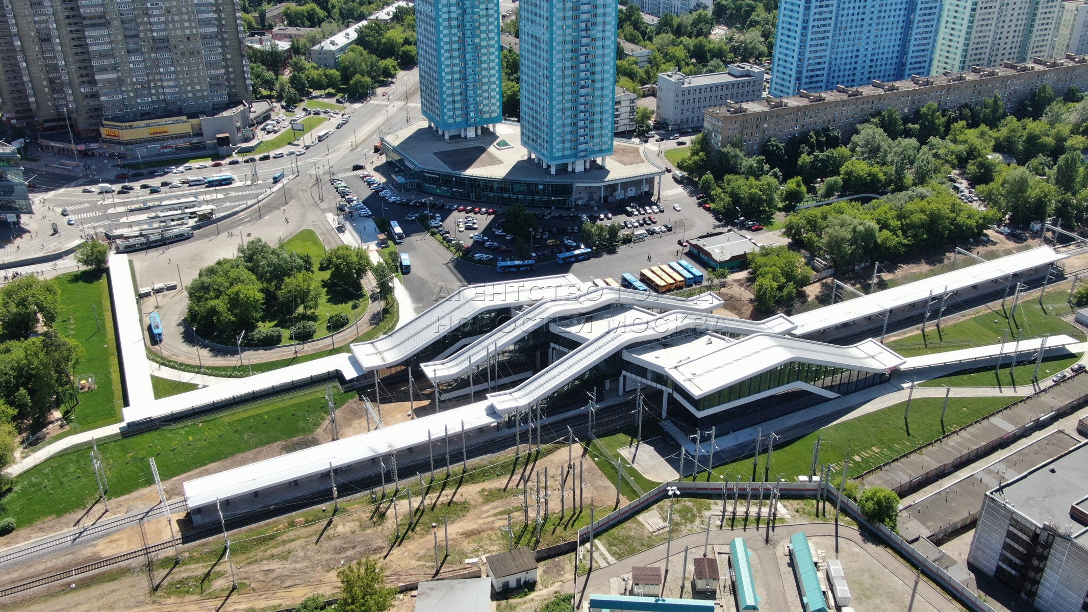 Вид с квадрокоптера на новый транспортно-пересадочный узел (ТПУ) «Щукинская» на базе станции МЦД-2 на северо-западе Москвы.