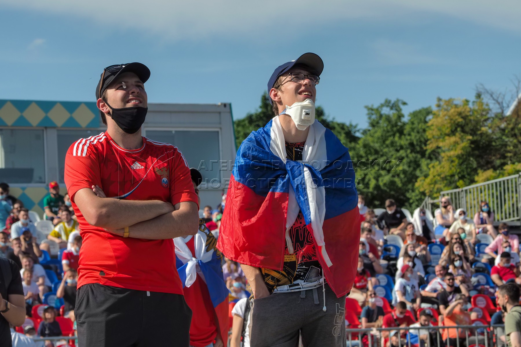 • Описание: Болельщики в фан-зоне на площади Южного спортивного центра в «Лужниках» во время просмотра матча Финляндия - Россия в рамках чемпионата Европы по футболу 2020.