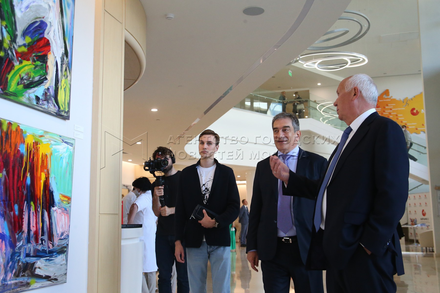 Основатель ГК «Мать и Дитя», председатель Совета директоров ГК, член-корреспондент РАМН Марк Курцер (второй справа) и генеральный директор ГК «Ростех» Сергей Чемезов (справа) во время персональной выставки художника Евгении Васильевой (EVA) «Плод» в клиническом госпитале «Лапино» группы компаний «Мать и дитя».