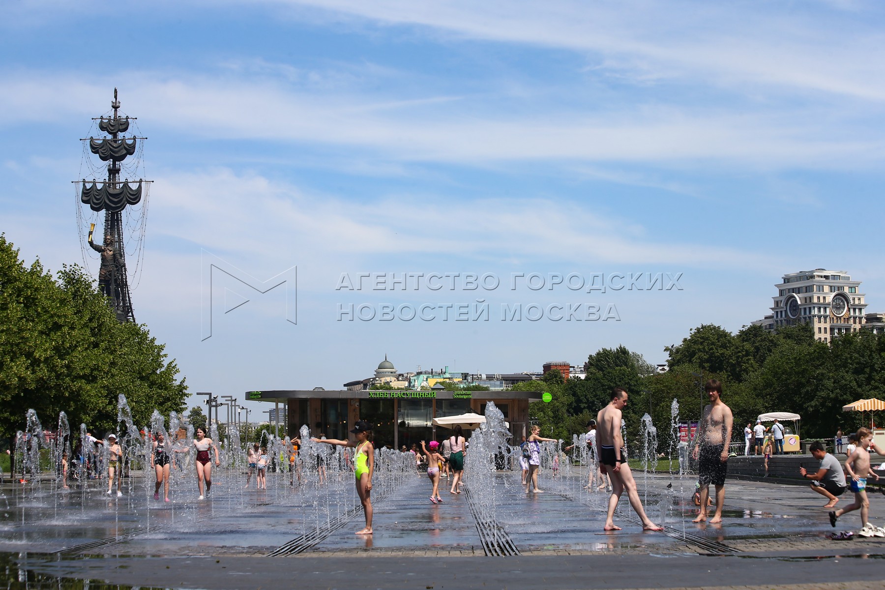 Жаркая погода в Москве 21 июня 2021 года. Фонтан в парке искусств «Музеон» на Кры...