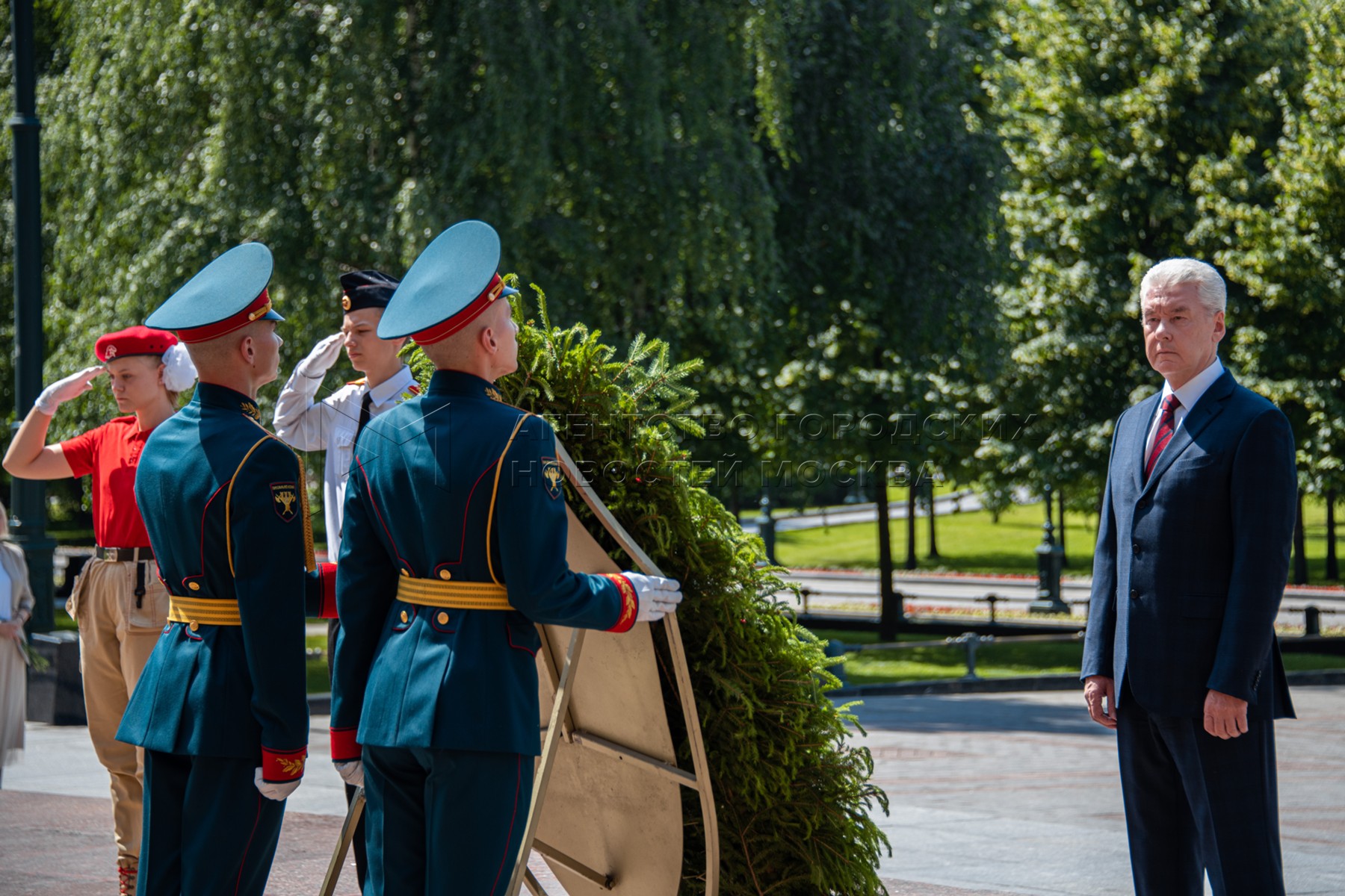 - Описание: Мэр Москвы Сергей Собянин возложил цветы к Могиле Неизвестного Солдата в Александровском саду в День памяти и скорби. Фото: Максим Мишин, пресс-служба мэра и правительства столицы.