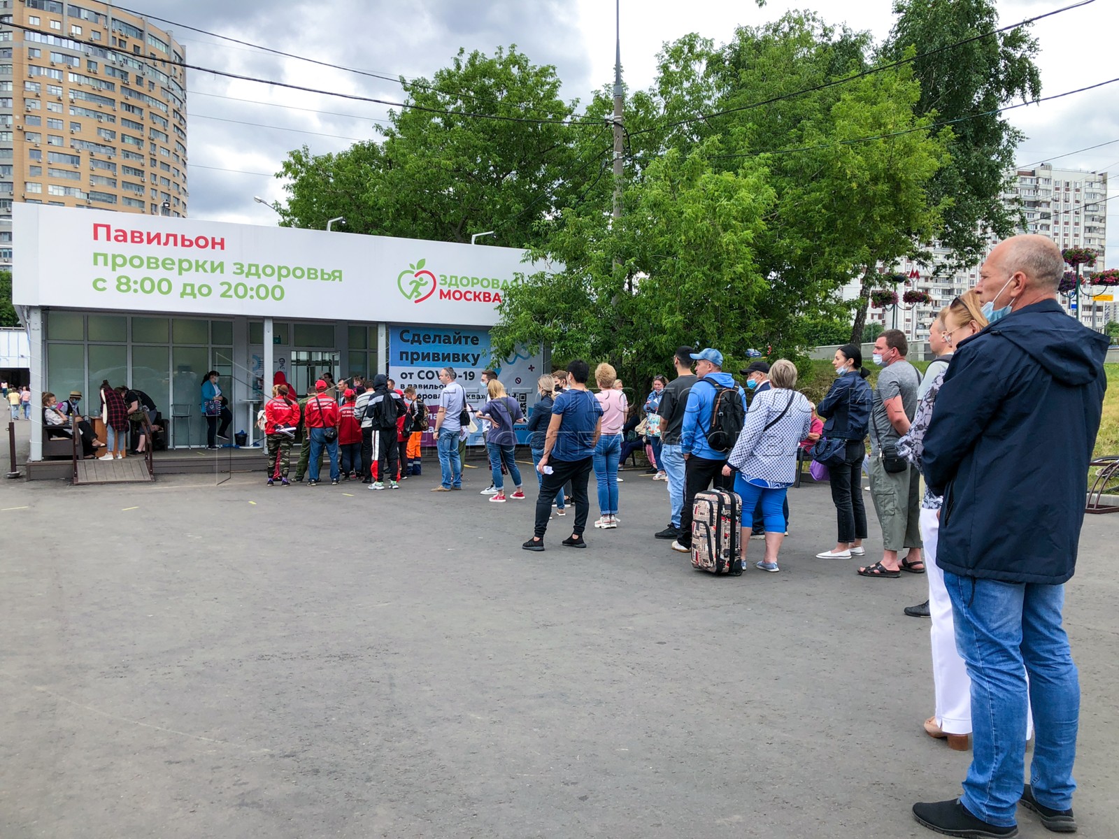 Очередь на вакцинацию от COVID-19 у павильона «Здоровая Москва» возле станции мет...