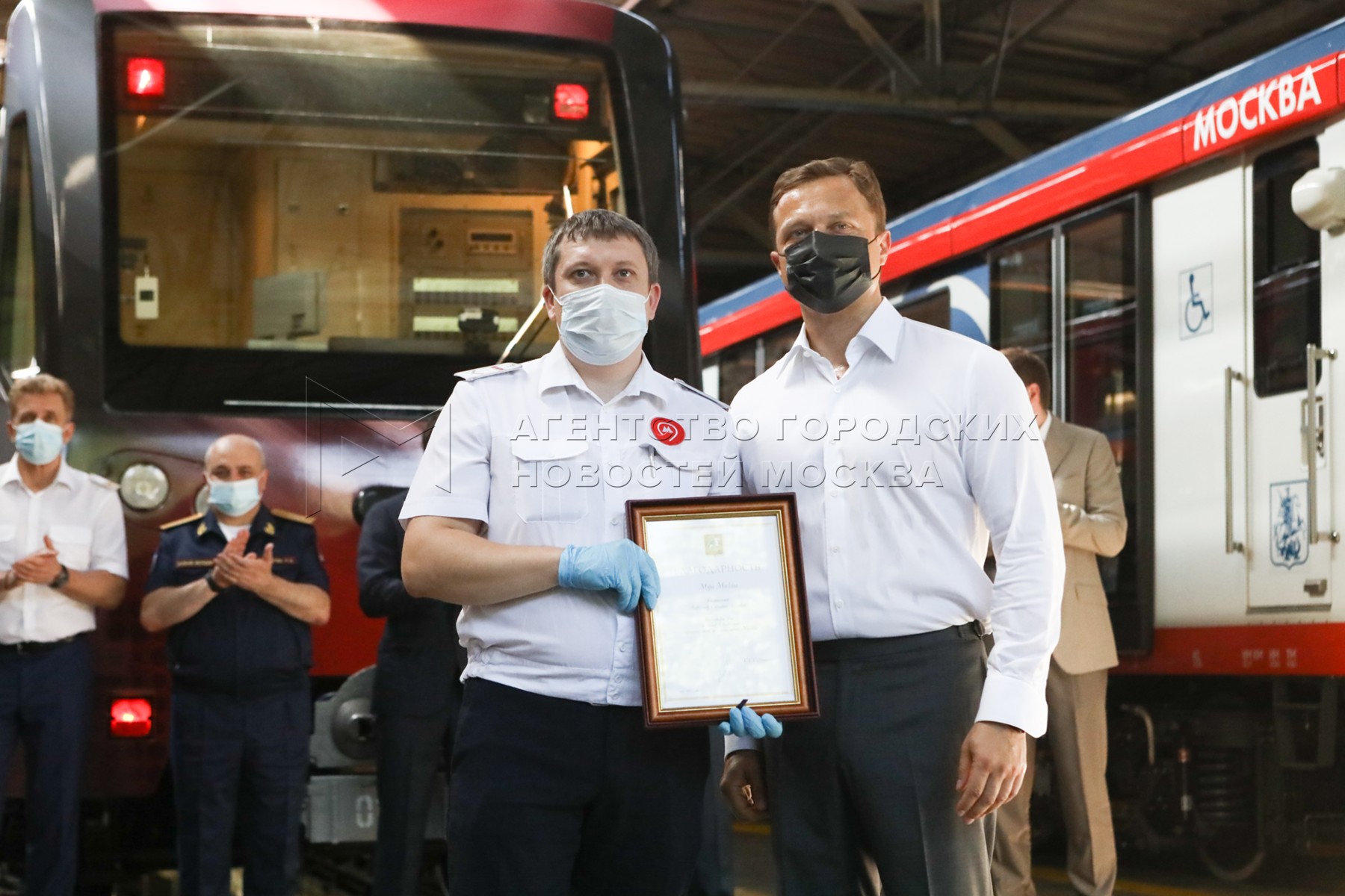 • Описание: Заместитель мэра Москвы по вопросам транспорта Максим Ликсутов (справа) во время запуска тематического поезда «Герои профессий» на Арбатско-Покровской линии Московского метрополитена.