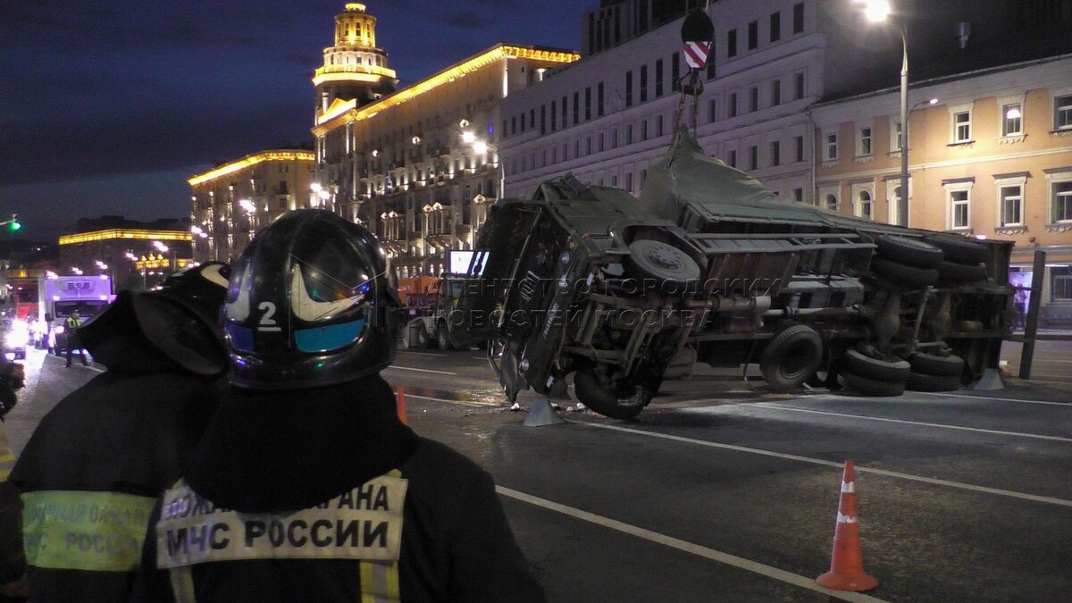 Последствия опрокидывания военного грузовика на Малой Сухаревской площади.