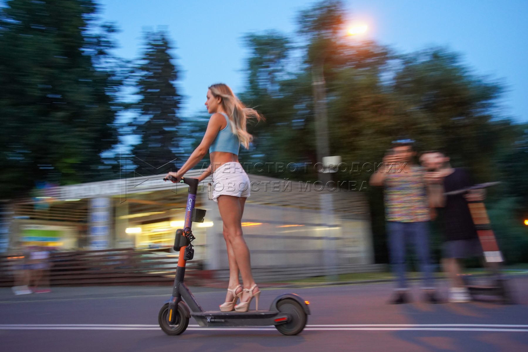 • Описание: Вечерний отдых горожан на Пушкинской набережной. Девушка на электросамокате.