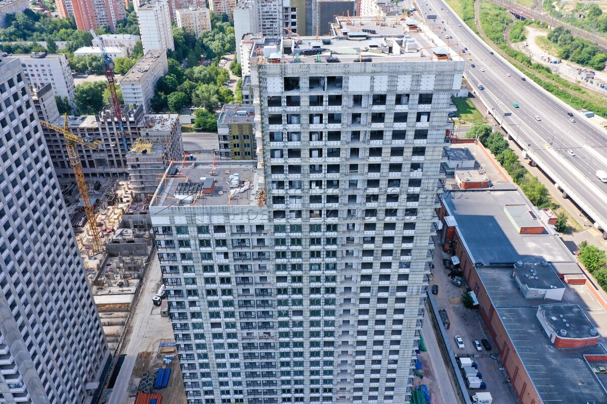 Вид с квадрокоптера на ход работ по строительству жилых домов на месте снесенной Ховринской больницы на севере Москвы.