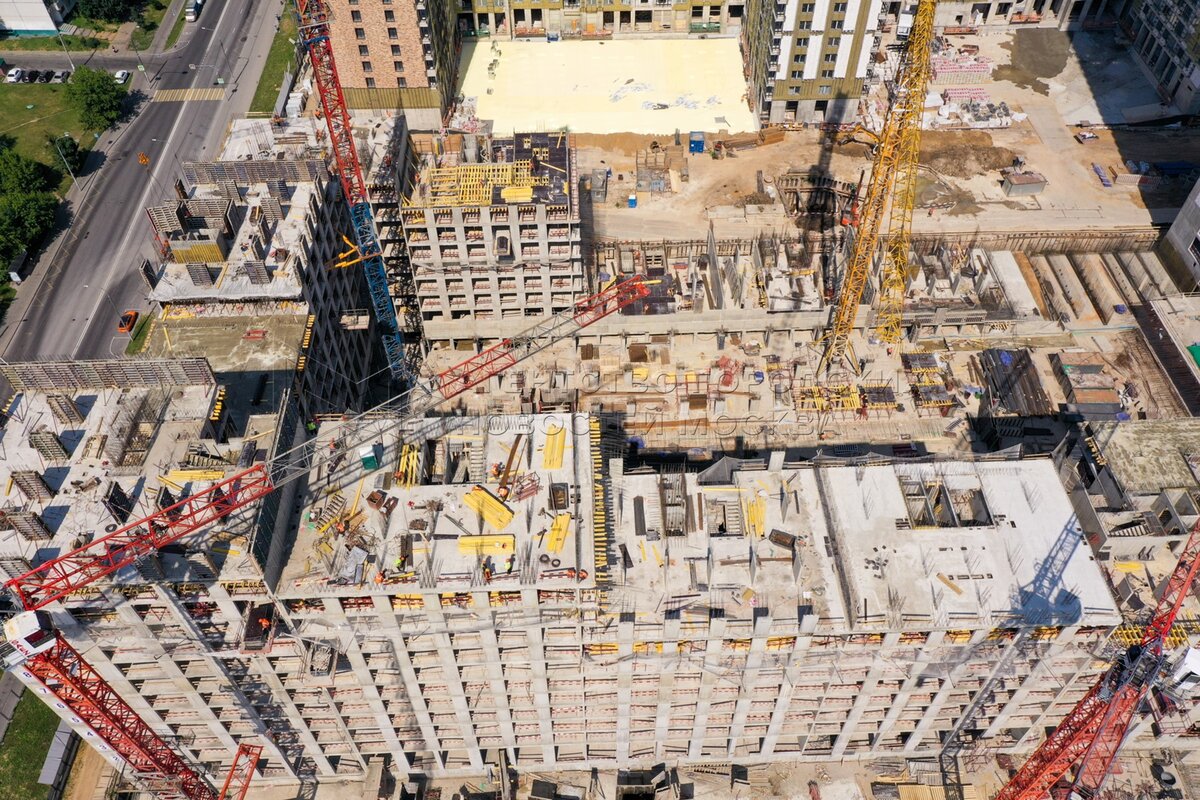 Вид с квадрокоптера на ход работ по строительству жилых домов на месте снесенной ...