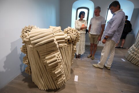 Художник Николай Полисский (второй справа) на открытии своей персональной выставк...