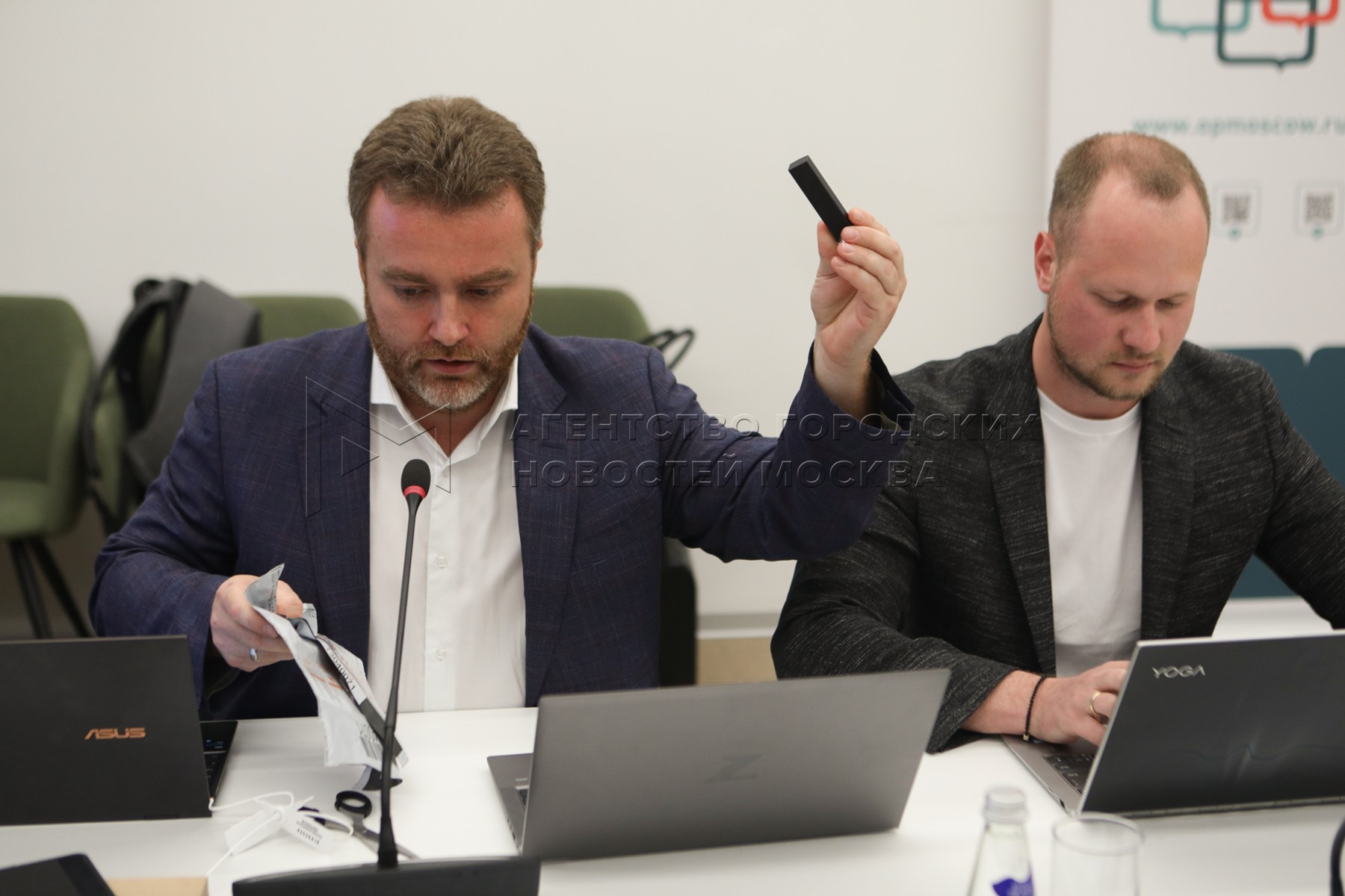 Начальник Управления по совершенствованию территориального управления и развитию смарт-проектов правительства Москвы Артем Костырко (слева) и начальник управления департамента информационных технологий города Москвы Владислав Шишмарев во время тестирования системы электронного дистанционного голосования в Москве, которая будет использоваться на выборах в сентябре этого года.