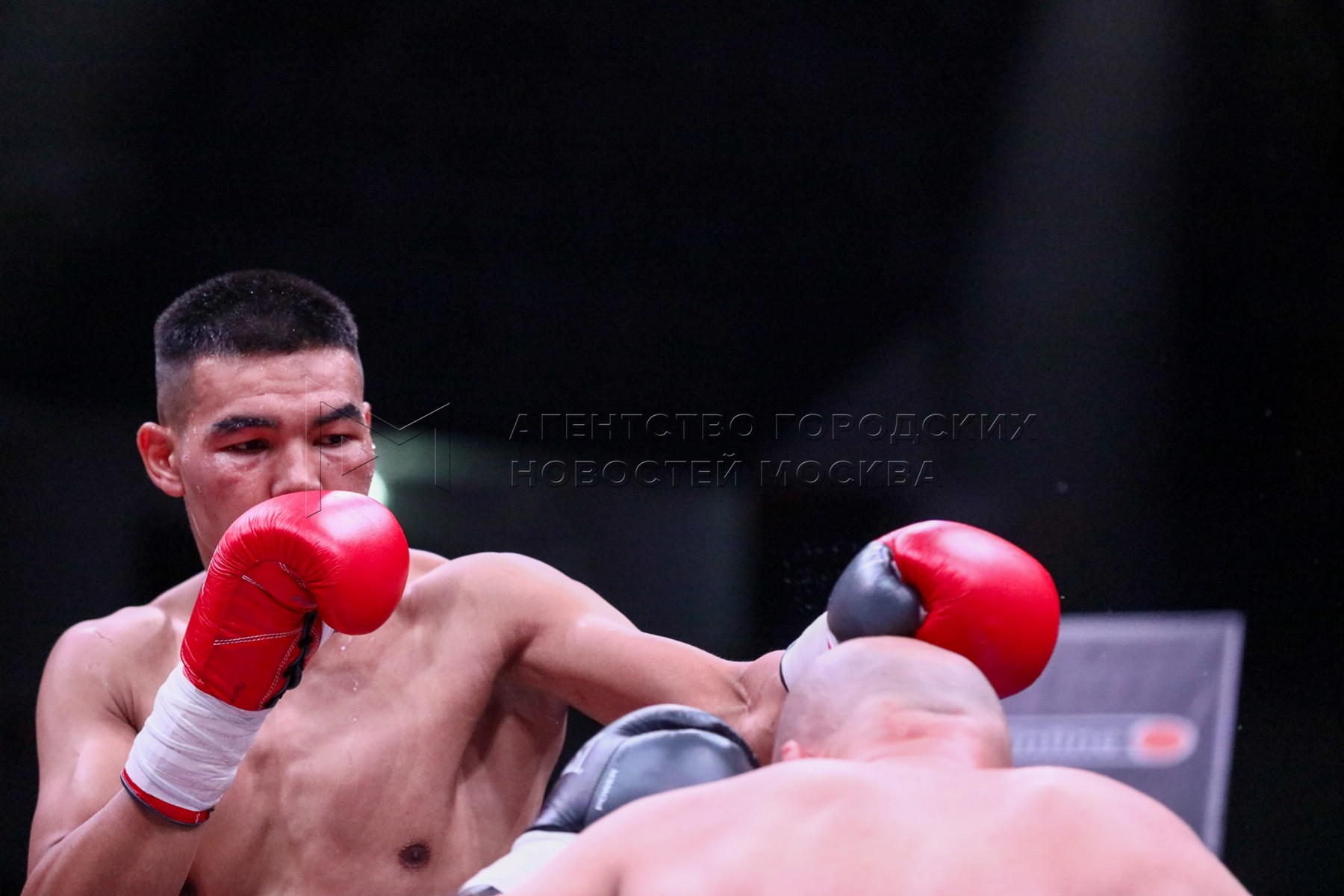Бой между узбекским спортсменом Хасанбой Мирзахамраевым (слева) и российским спортсменом Кириллом Бахтиным на турнире в рамках «Бойцовского клуба РЕН ТВ» на волейбольной арене «Динамо».