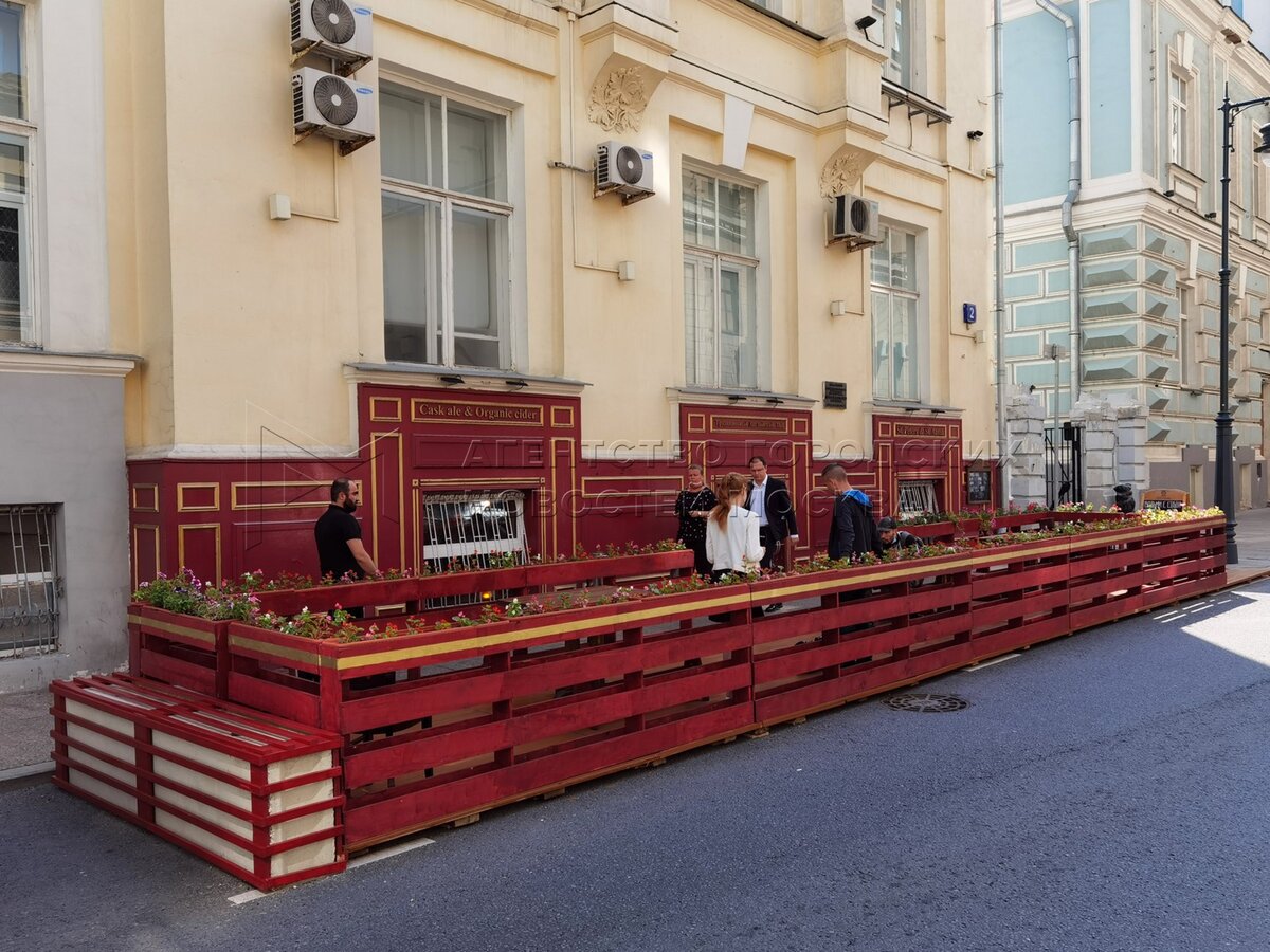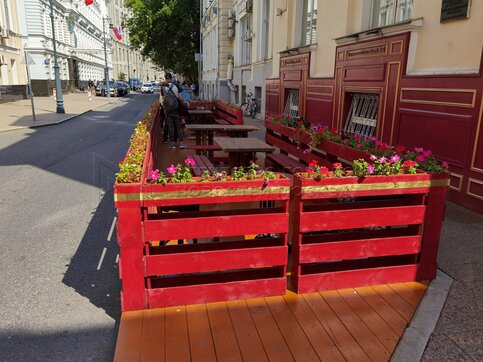Первые в Москве парклеты (небольшие летние веранды, которые установлены возле проезжей части на местах парковок автомобилей) в Никитском пер.