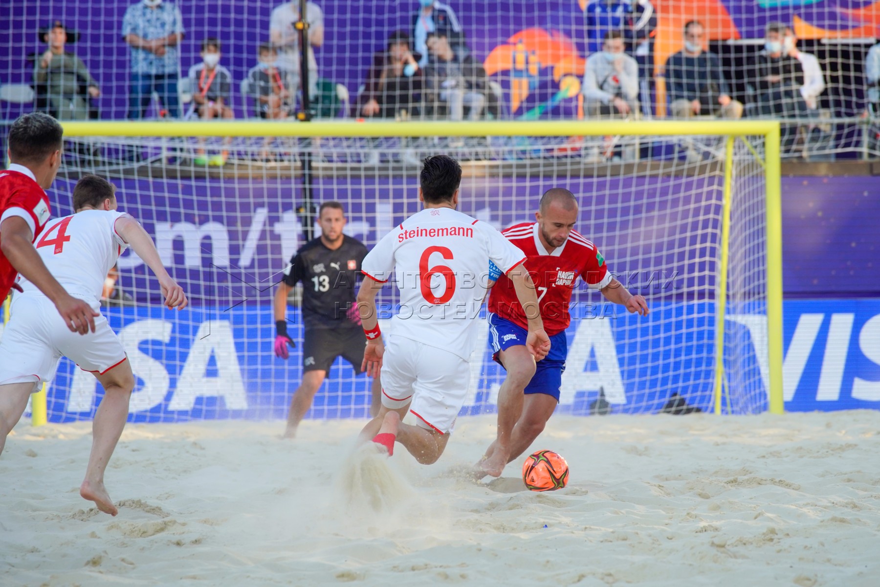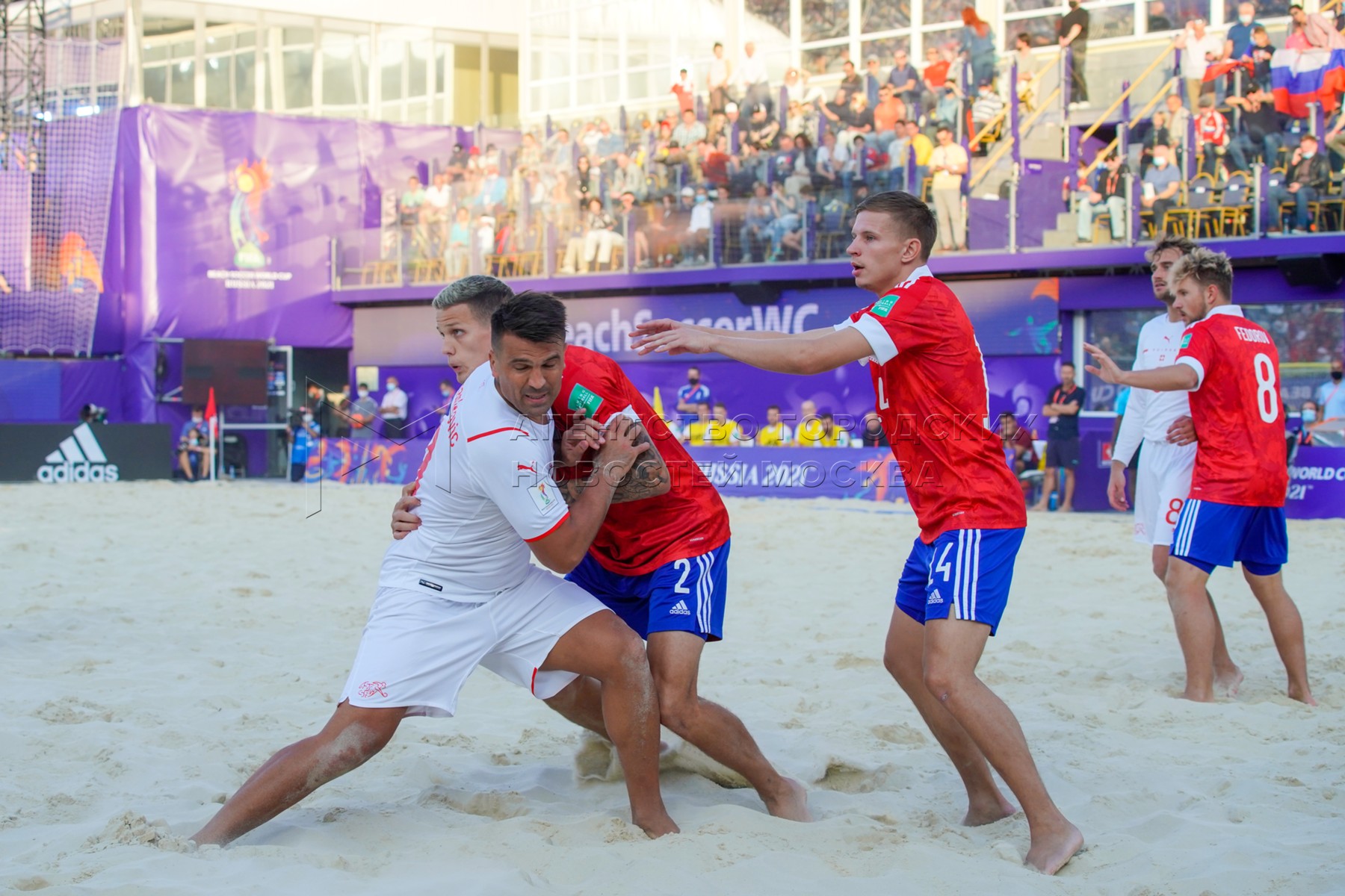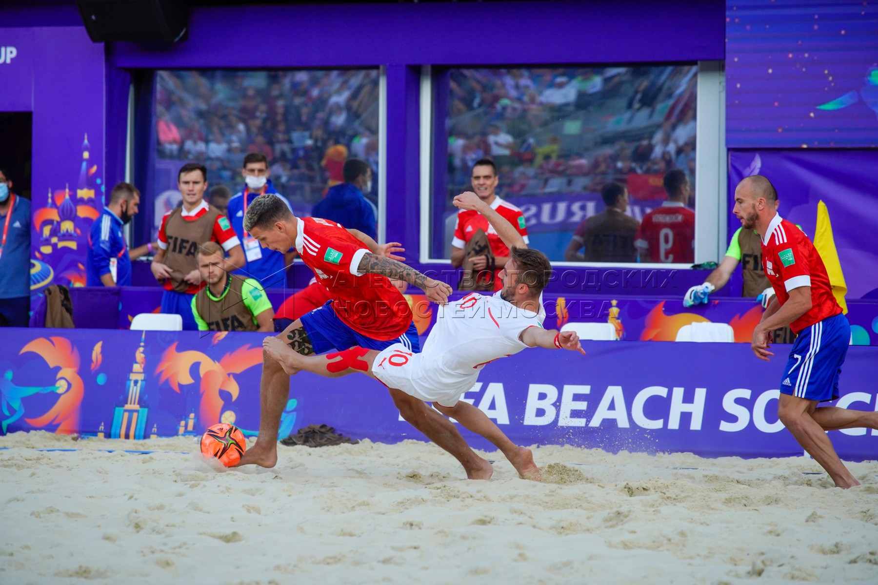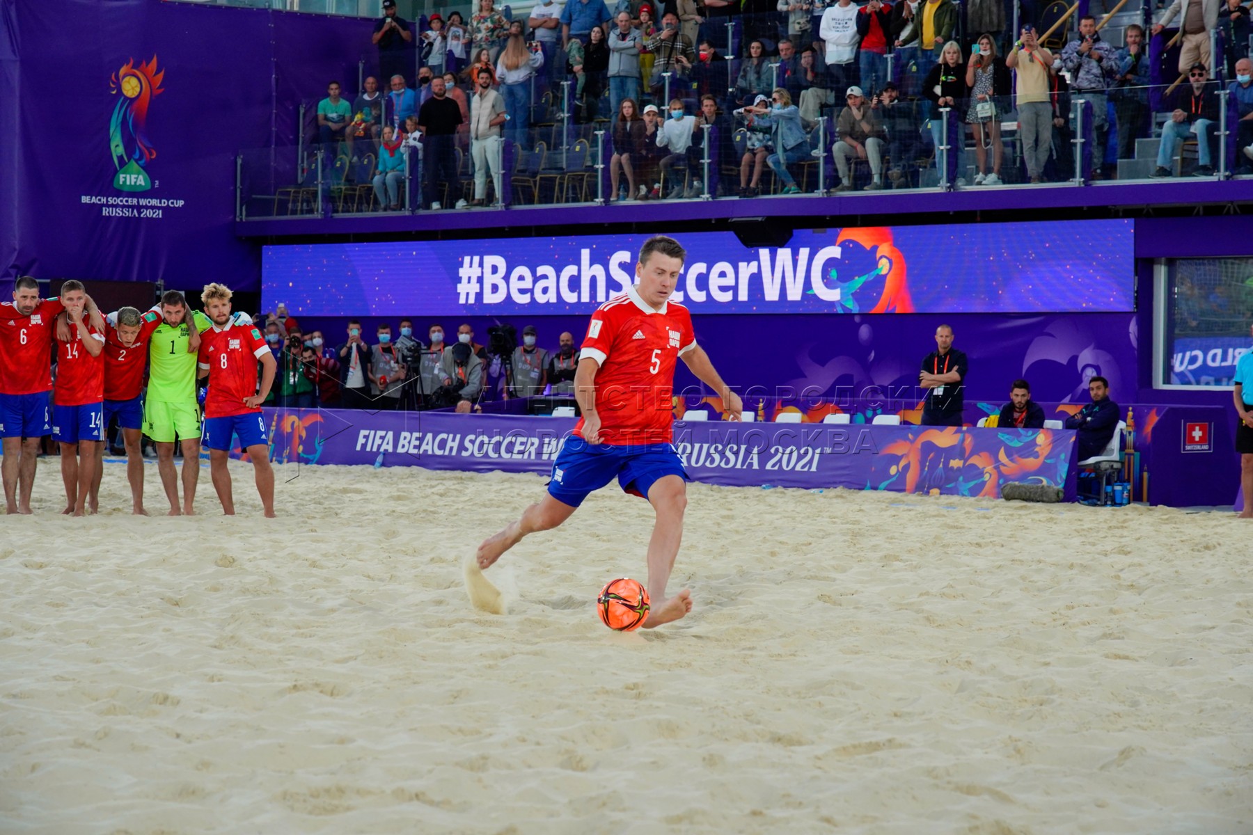 - Описание: Чемпионат мира по пляжному футболу 2021 между сборными России и Швейцарии в спорткомплексе «Лужники».