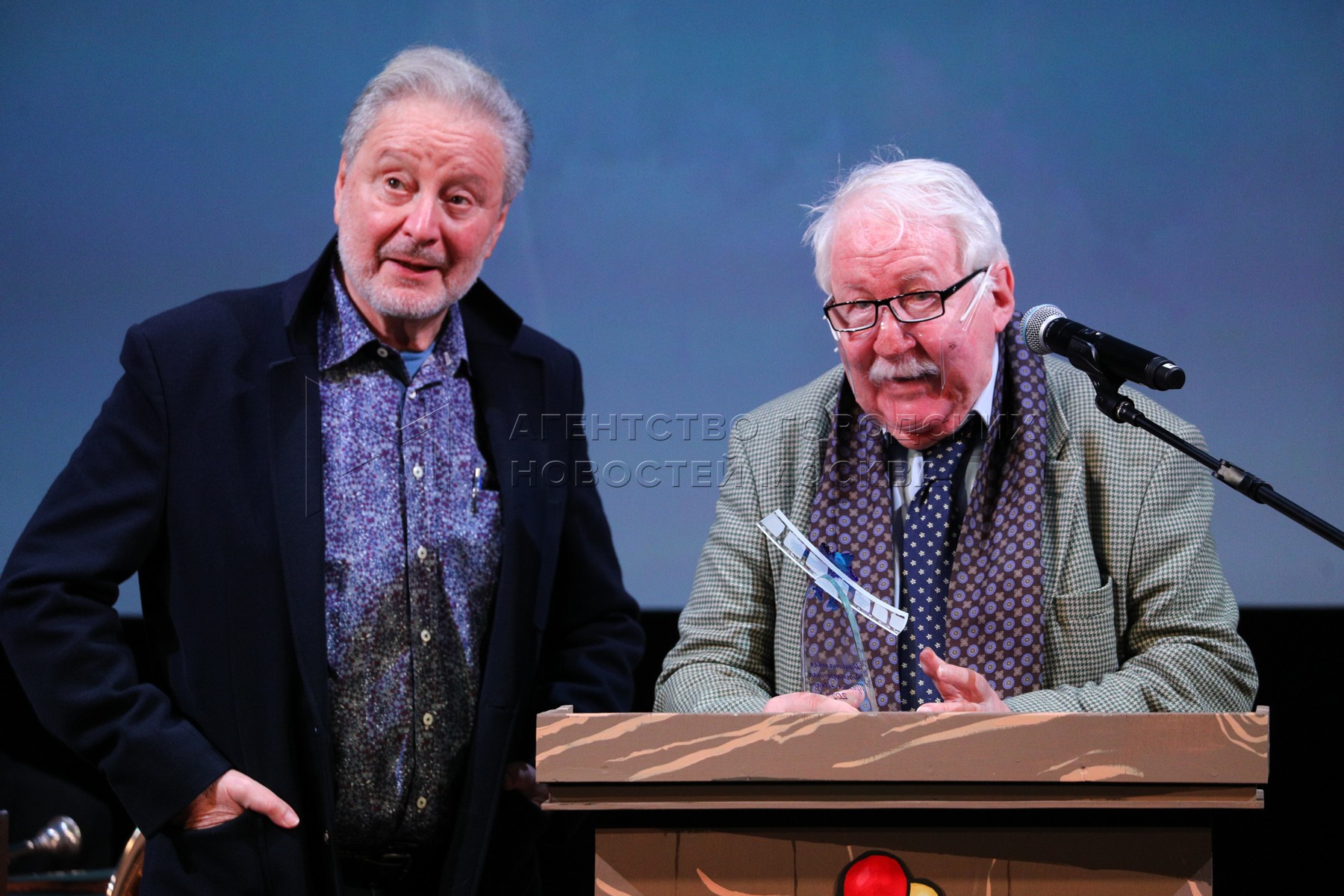 Актер Вениамин Смехов, режиссер Андрей Хржановский (слева направо) на церемонии вручения VII Национальной анимационной премии «Икар» в кинотеатре «Художественный».