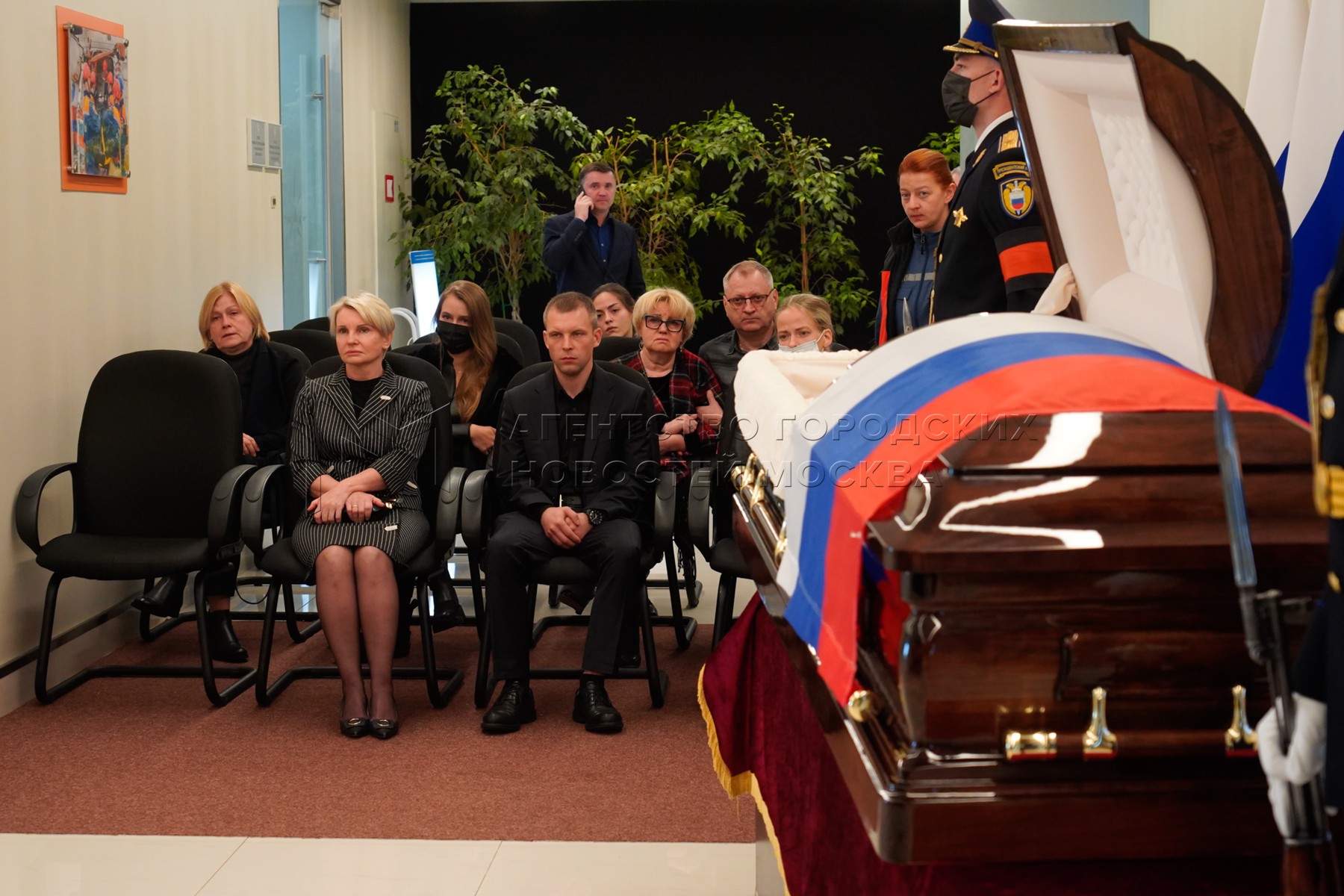 Семья главы МЧС РФ Евгения Зиничева у гроба во время церемонии прощания с главой ...