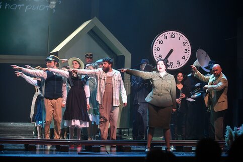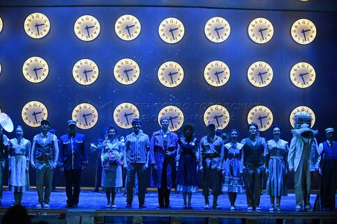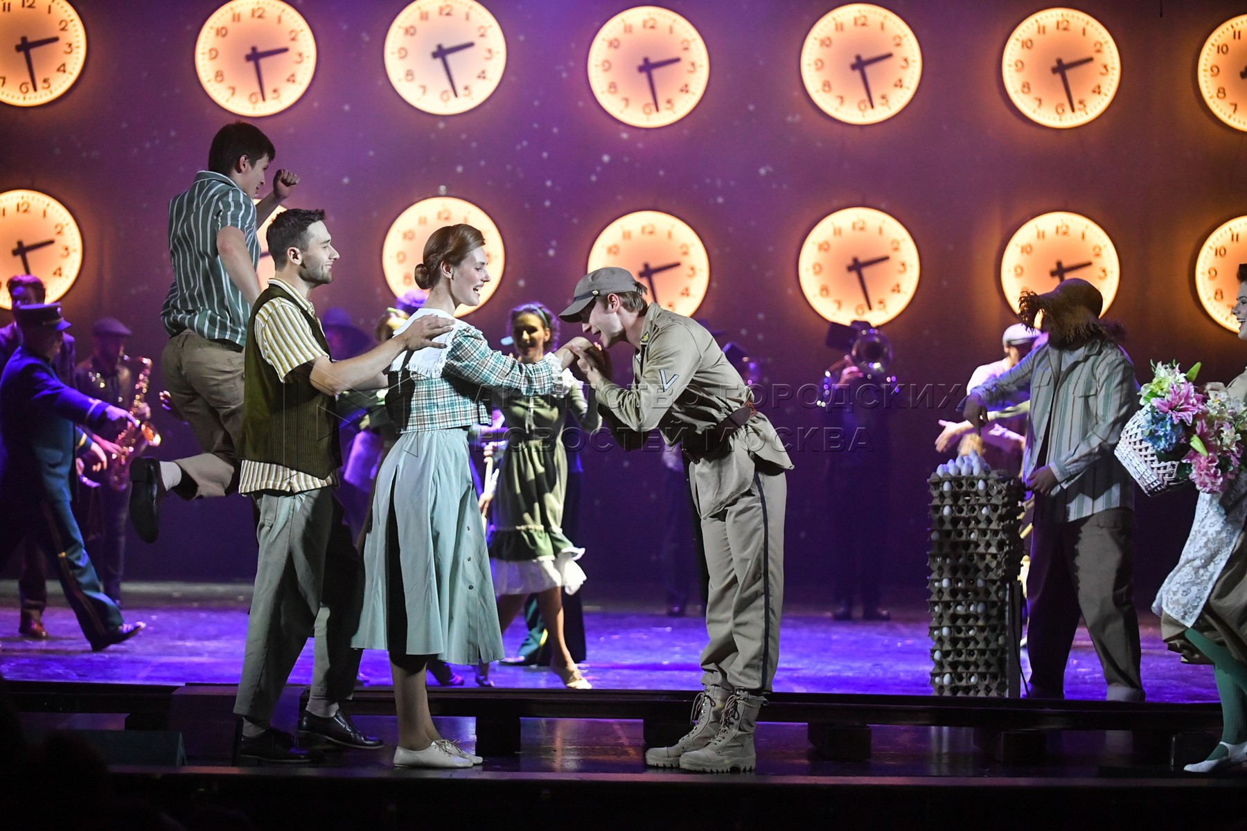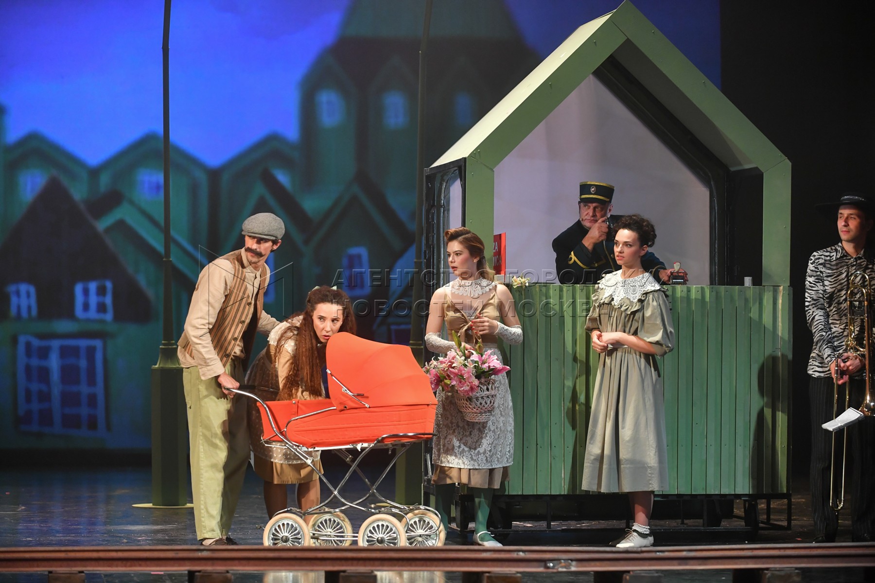 Актер Александр Тютин в роли Начальника вокзала (Испаса) (справа) во время премье...