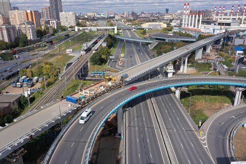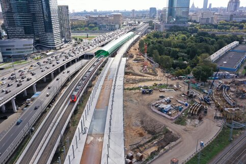 - Описание: Вид с квадрокоптера на строительство четвертого маршрута Московских центральных диаметров (МЦД-4) и Северного дублера Кутузовского проспекта в районе московского международного делового центра «Москва-Сити».