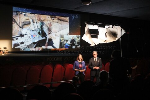 Трансляция в кинотеатре «Москино Космос» запуска космического корабля «Союз МС-19» с космодрома Байконур с членами съемочной группы фильма «Вызов» - актрисой Юлией Пересильд и режиссером Климом Шипенко - к Международной космической станции (МКС).