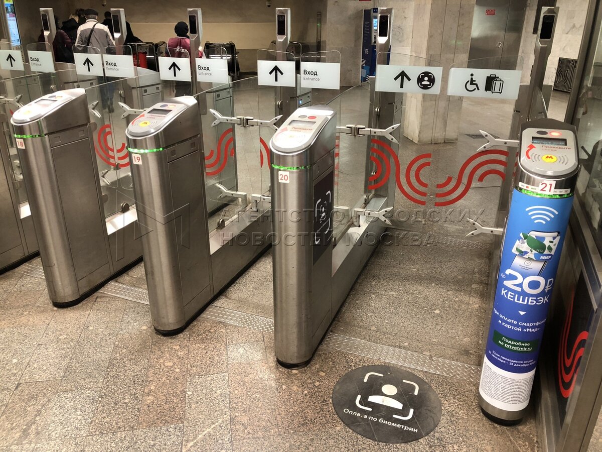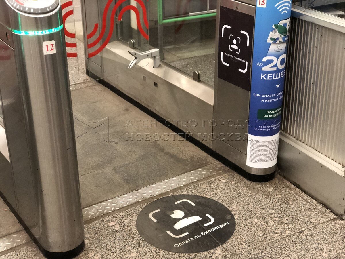 • Описание: Указатели у турникетов в московском метро о возможности оплатить проезд с помощью системы Face Pay.