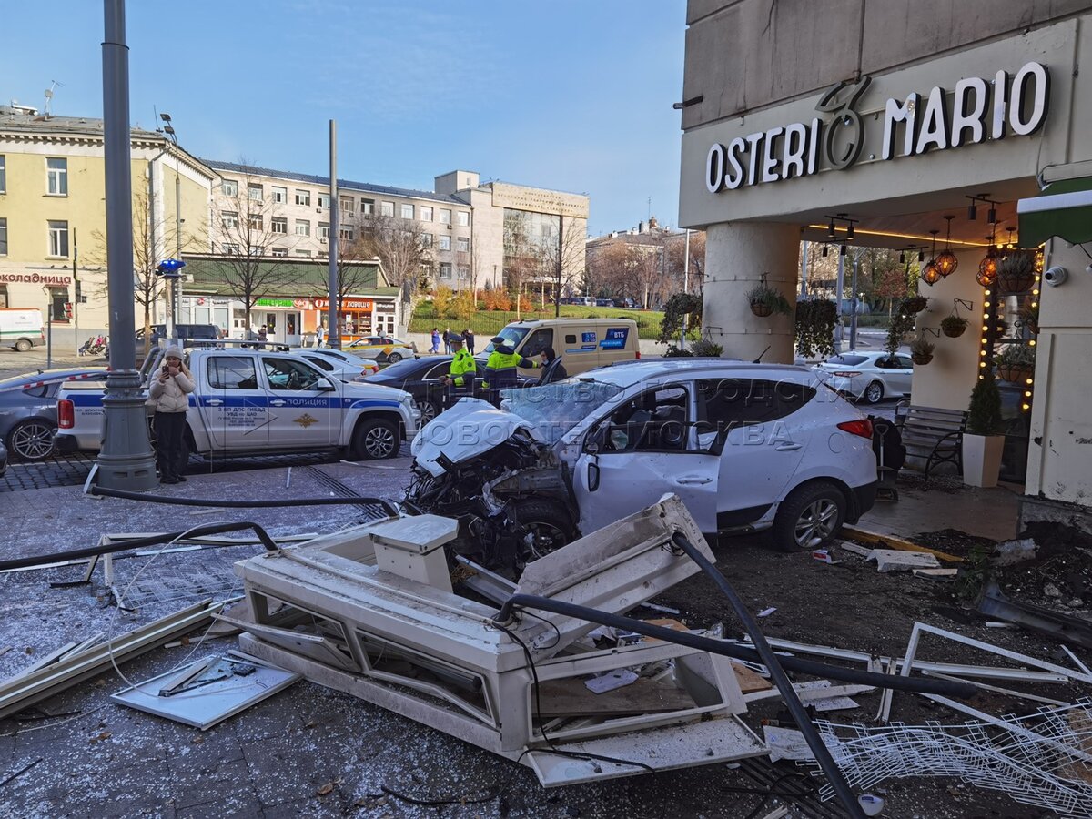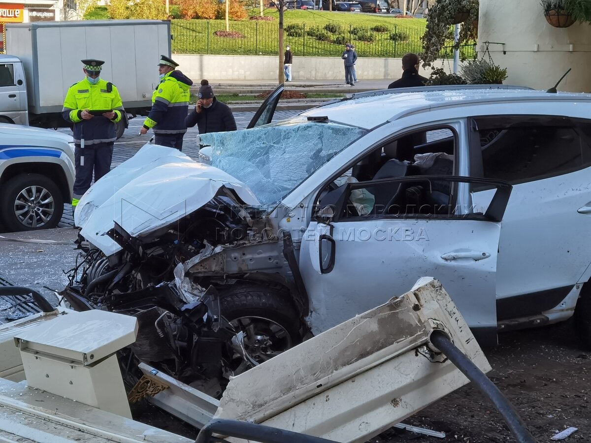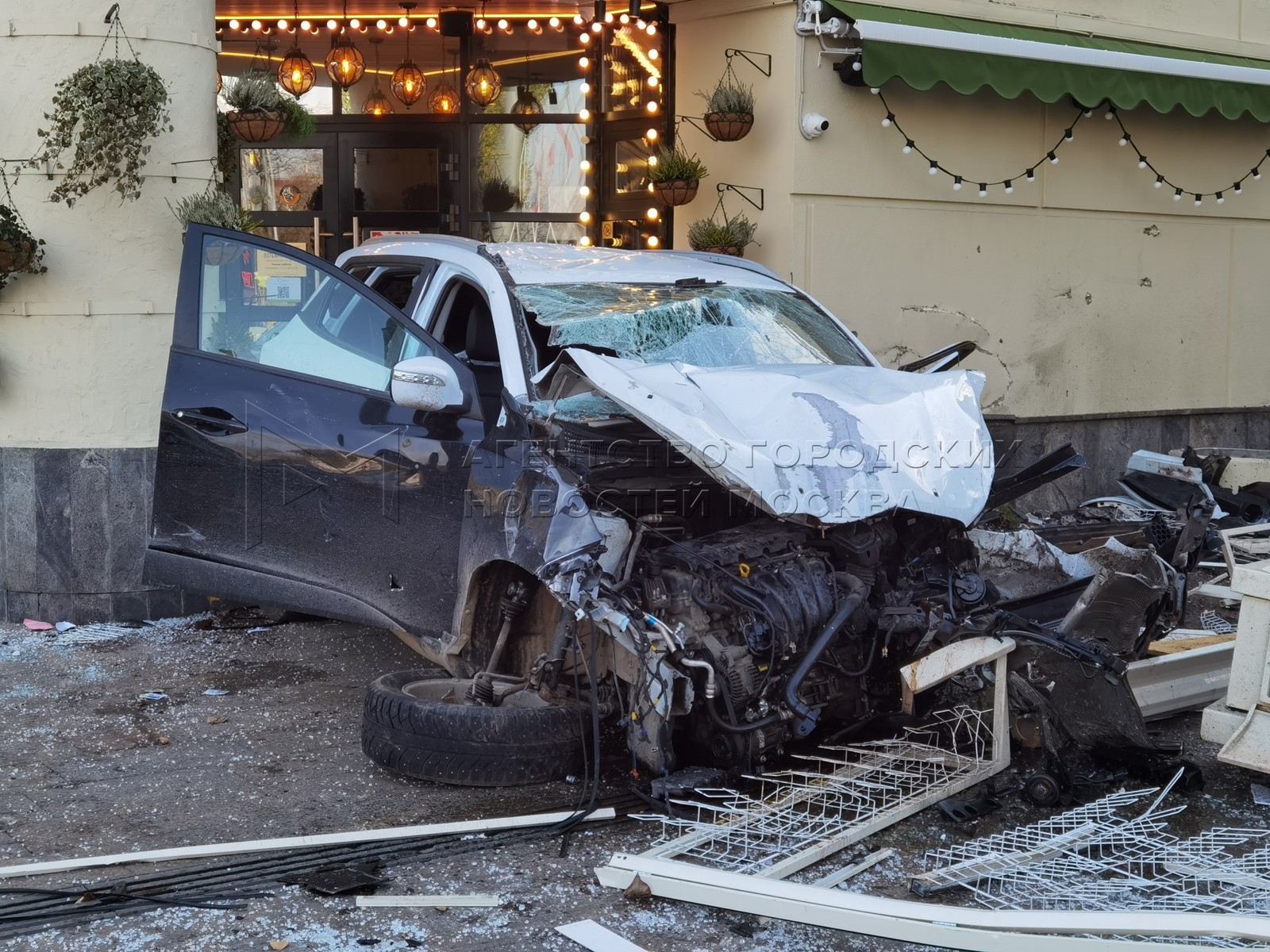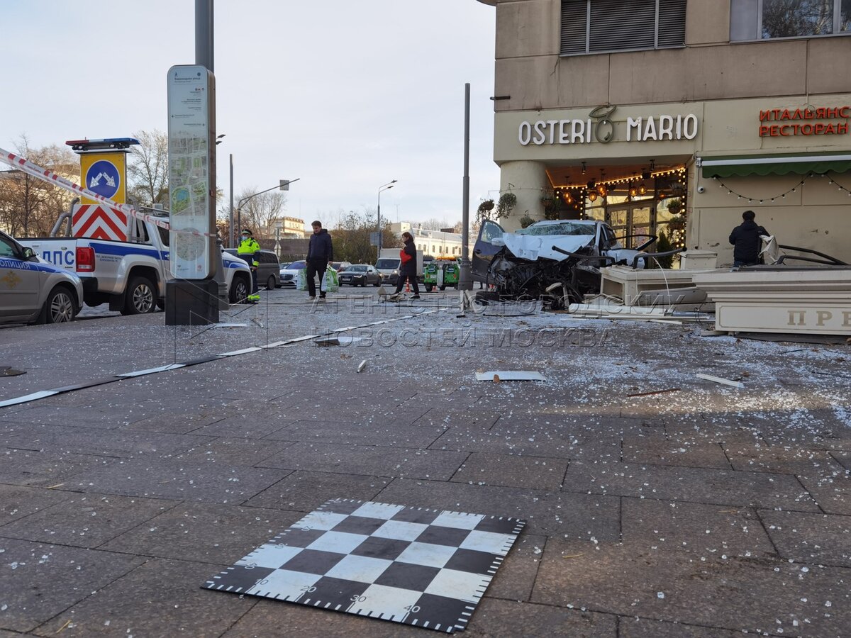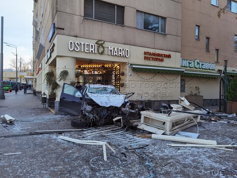- Заголовок: Последствия ДТП в Пресненском районе, где легковой автомобиль выехал на тротуар и врезался в стену здания