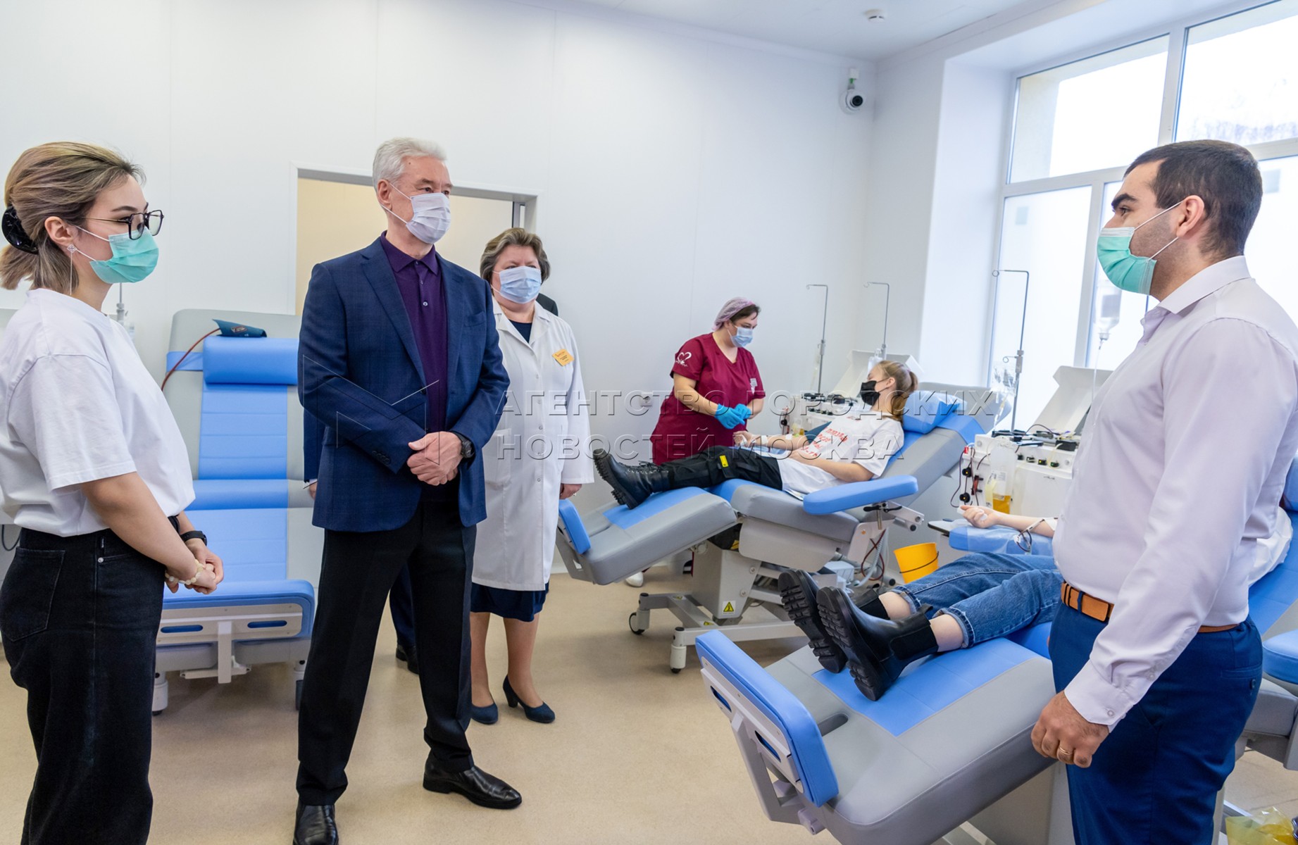 Мэр Москвы Сергей Собянин (в центре) посетил пункт заготовки плазмы с антителами ...