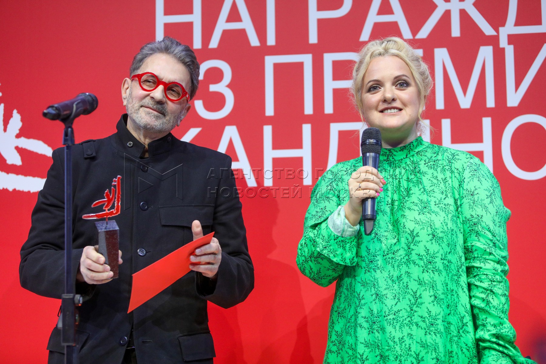 - Описание: Финалист проекта года, художник Андрей Кузькин и директор Мультимедиа Арт Музея Ольга Свиблова во время награждения лауреатов 13-й премии Кандинского в Московском музее современного искусства на ул. Петровка.