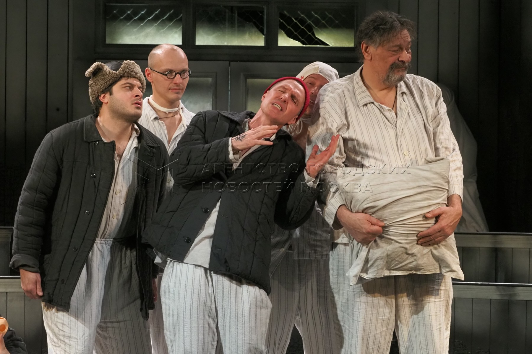 - Описание: Актеры Армэн Арушанян в роли Вовы, Владимир Кузнецов в роли Коли, Игорь Верник в роли Прохорова, Николай Сальников в роли Алехи и Дмитрий Назаров в роли Гуревича (слева направо) во время показа фрагментов премьерного спектакля «Вальпургиева ночь» по пьесе Венедикта Ерофеева в постановке Уланбека Баялиева в Московском художественном театре (МХТ) имени Чехова.