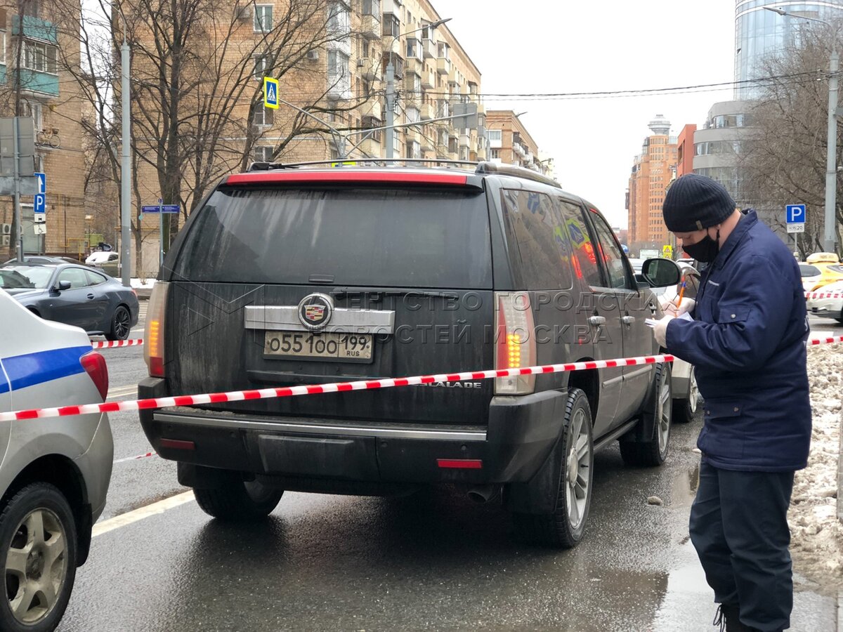 - Описание: Сотрудники оперативных служб на месте дорожного конфликта со стрельбой в Тверском районе столицы.