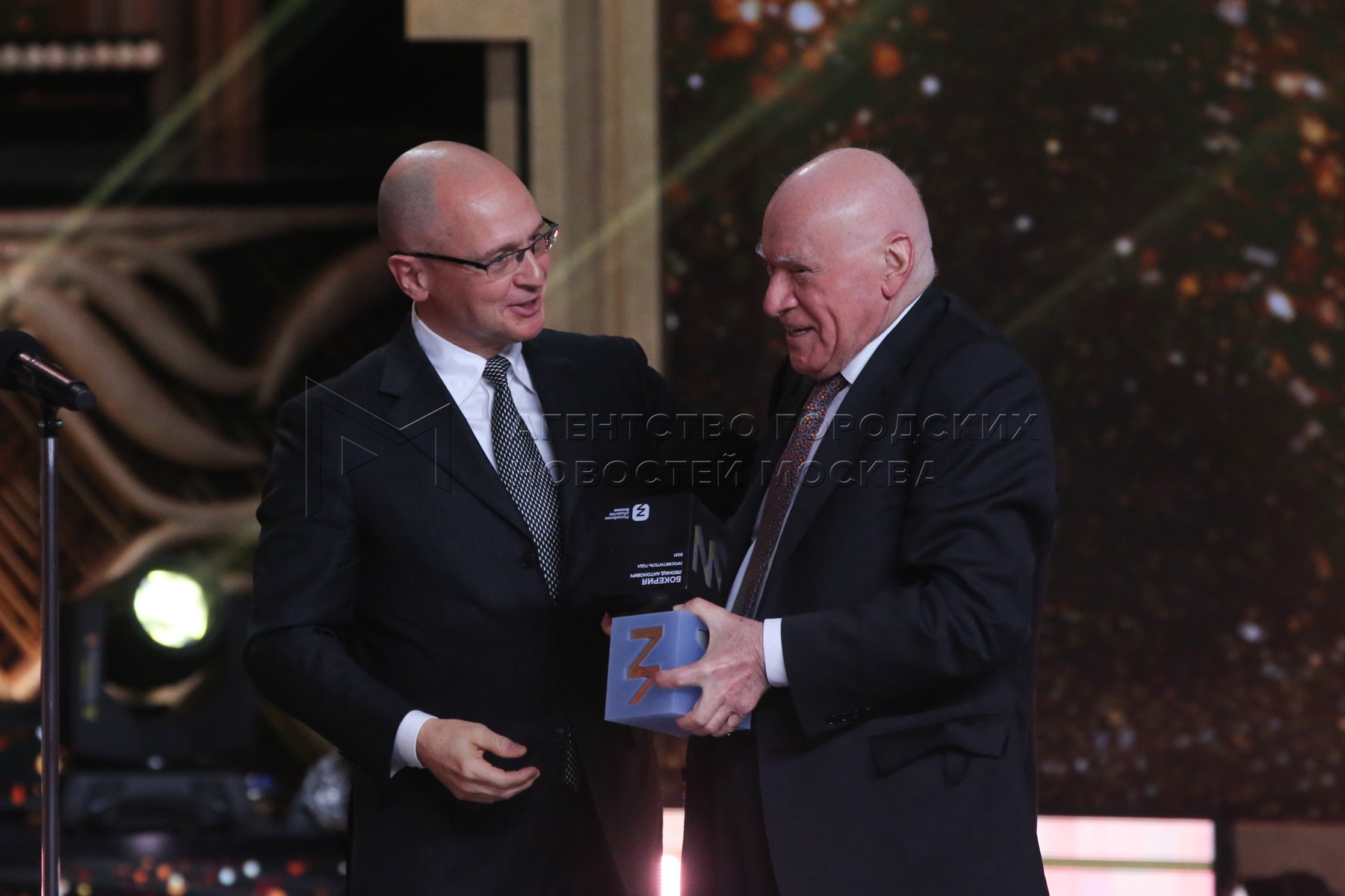 Член жюри премии «Знание», председатель наблюдательного совета Российского общества «Знание», первый заместитель руководителя Администрации президента РФ Сергей Кириенко (слева) и кардиохирург, президент Национального медицинского исследовательского центра сердечно-сосудистой хирургии имени А.Бакулева Лео Бокерия, получивший премию в номинации «Просветитель года», во время церемонии вручения в Московском театре мюзикла премии «Знание» лучшим просветителям 2021 года.
