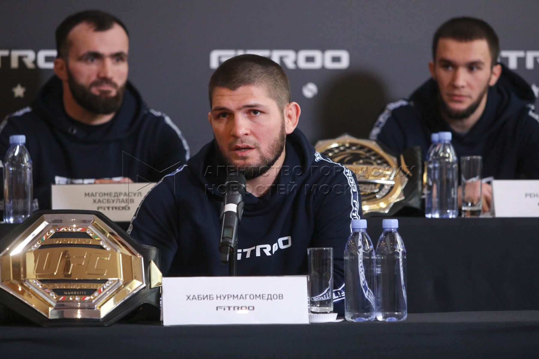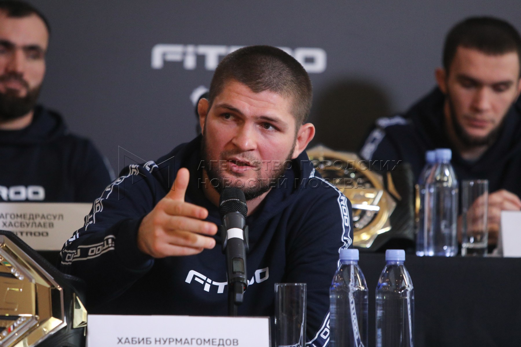 • Описание: Боец смешанных единоборств, экс-чемпион UFC в легком весе Хабиб Нурмагомедов во время пресс-конференции.