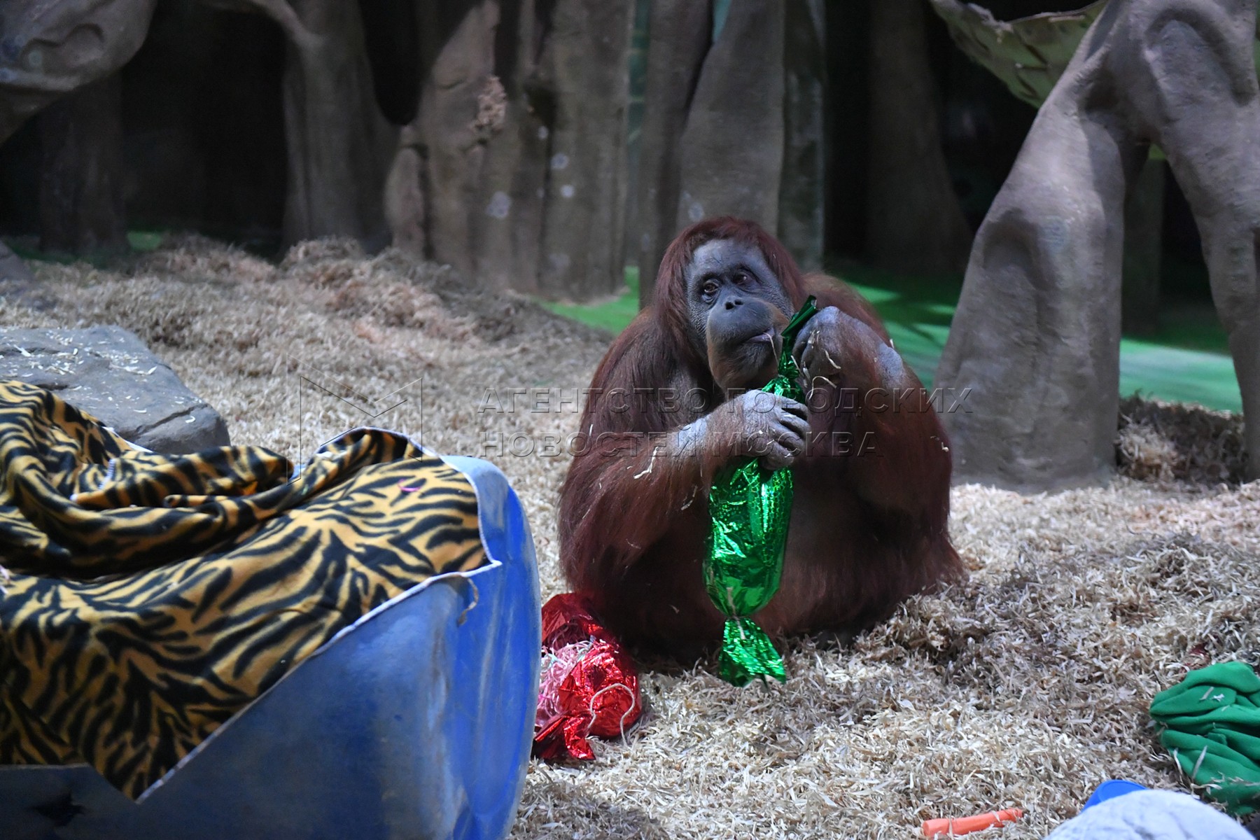 Поздравление орангутанов с Новым годом и вручение им подарков с тигриным принтом в Московском зоопарке.